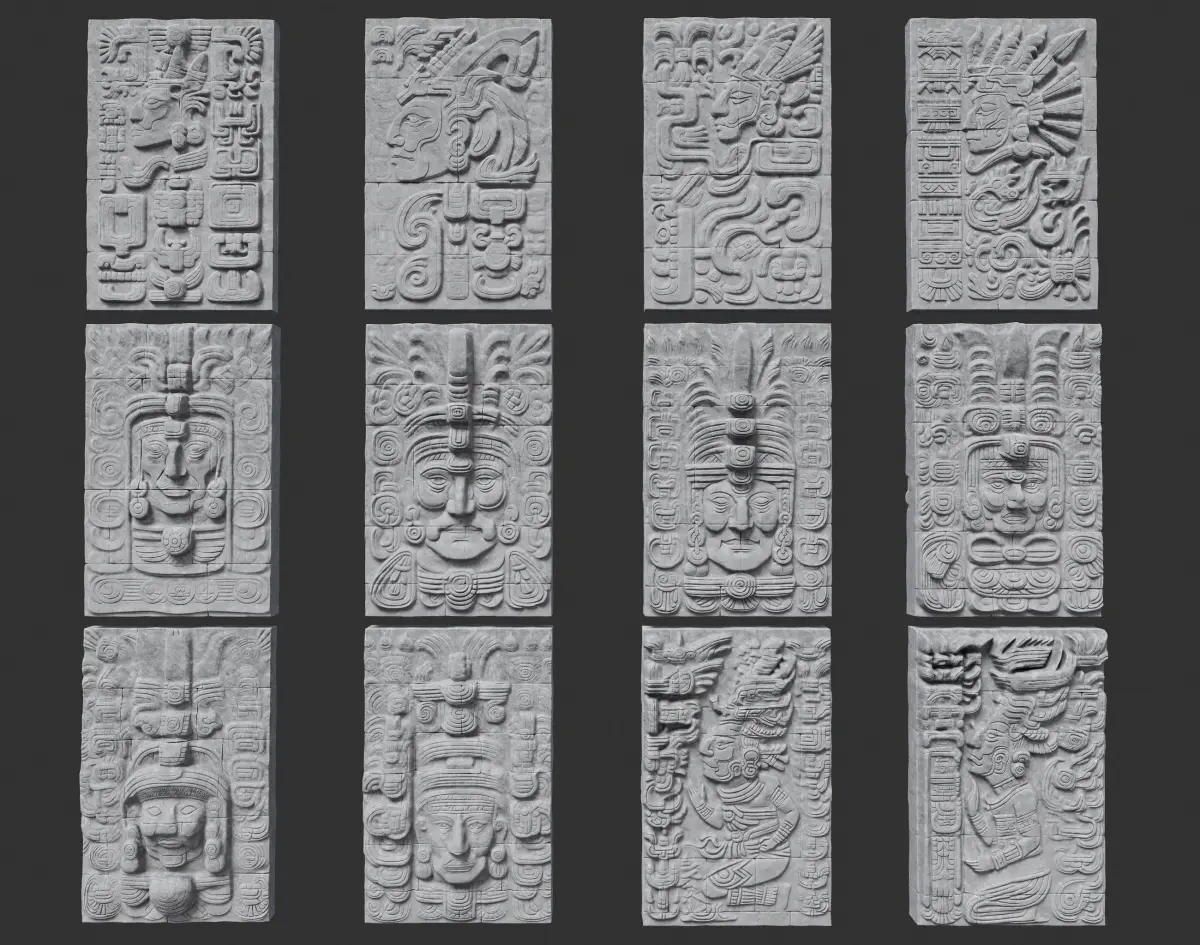 This product consists of 12 3D models of Mayan Temple Walls. These models are decorated with patterns and characters, following the ancient Mayan style. You can use them to enhance the liveliness of your project.