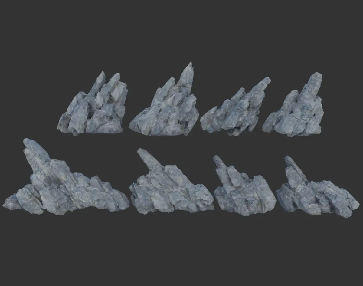 This product consists of 8 3D models of rock formations. The shape of this rock is relatively flat with many cracks, and the edges are quite sharp, giving a sense of hardness to the rock. The details of the model are depicted in all different angles, so you can replicate them, then rotate, flip, scale to combine them and create a variety of shapes.