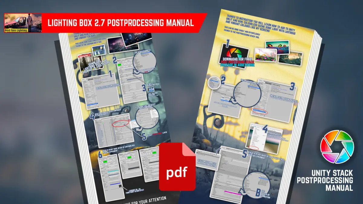 - Inclue two pdf manuals with postprocessing setup (Unity Stack and LightingBox2)