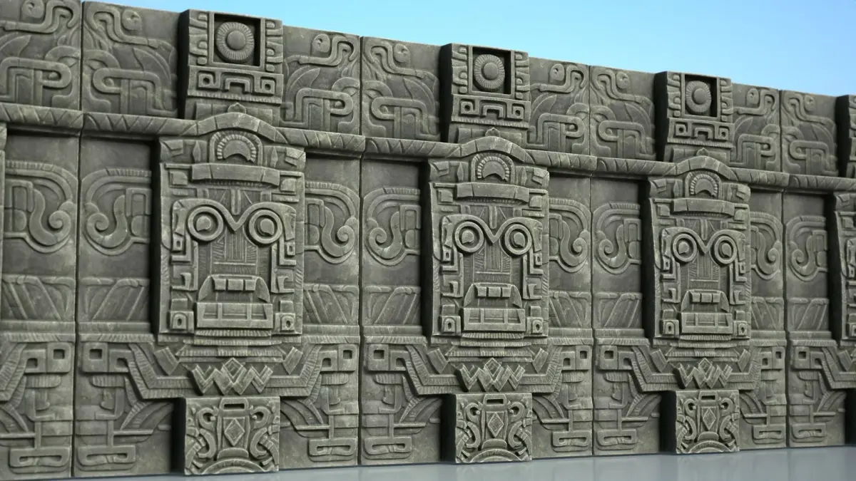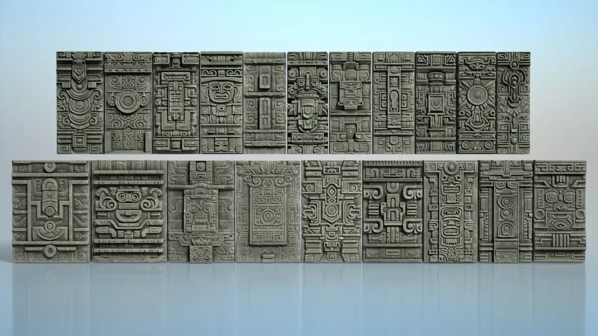 This product consists of 20 3D models of Mayan Walls. These models are decorated with patterns and characters, following the ancient Mayan style. You can use them to enhance the liveliness of your project.