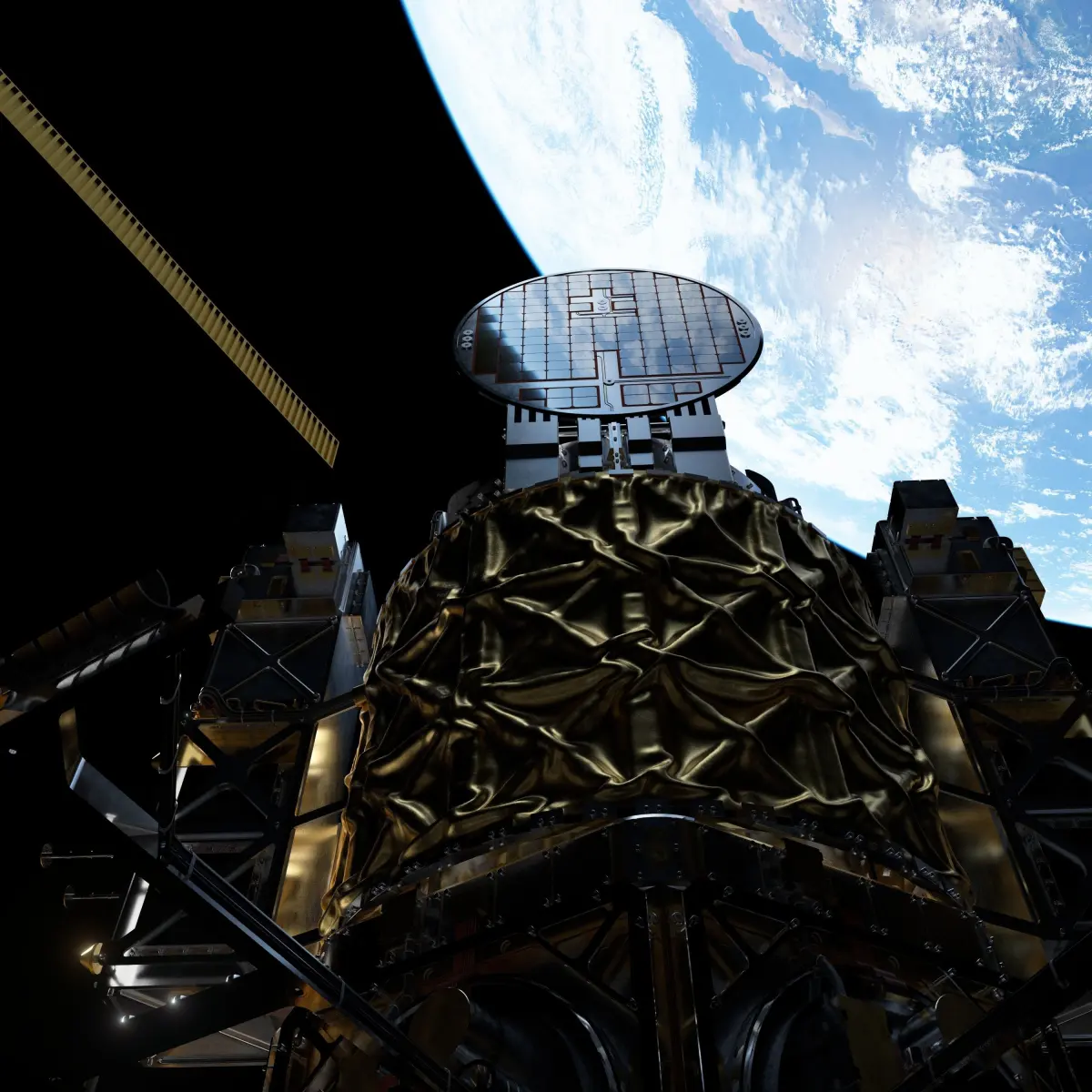 A highly detailed photo-real model of a reflector-style spy/photographic satellite.