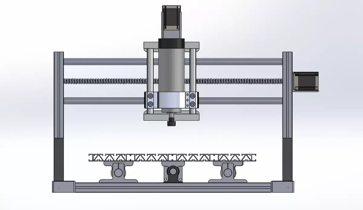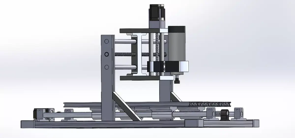 - Fully modeled mechanical components (frame, motors, spindle, and supports).