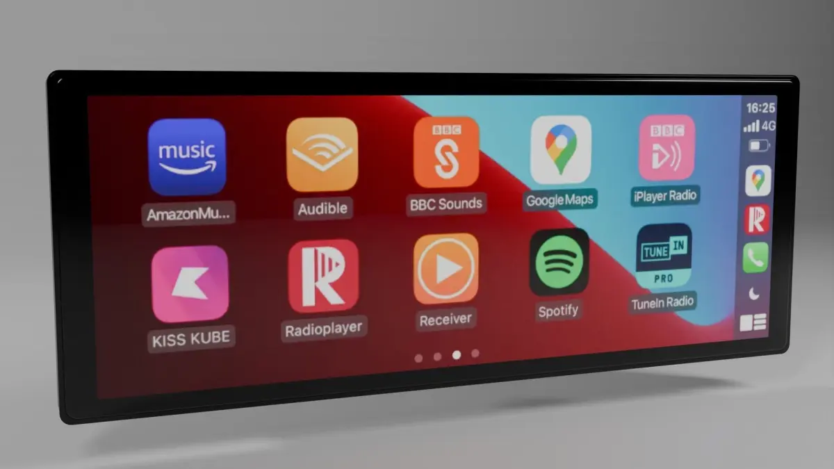 Enhance your digital designs with this meticulously crafted 3D model of a car infotainment screen, perfect for automotive visualizations, simulations, and game development. This model features a sleek, modern design with a detailed interface showcasing popular applications like Amazon Music, Audible, BBC Sounds, Google Maps, Spotify, and more.