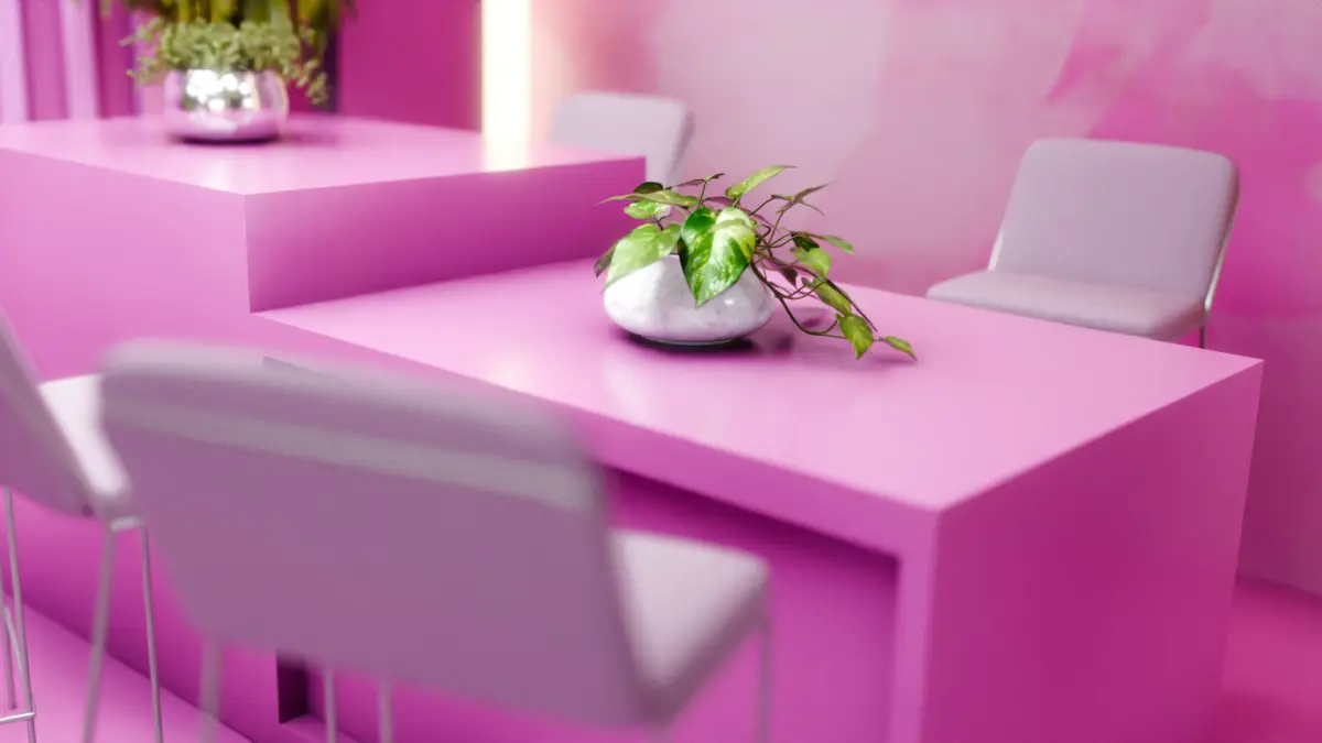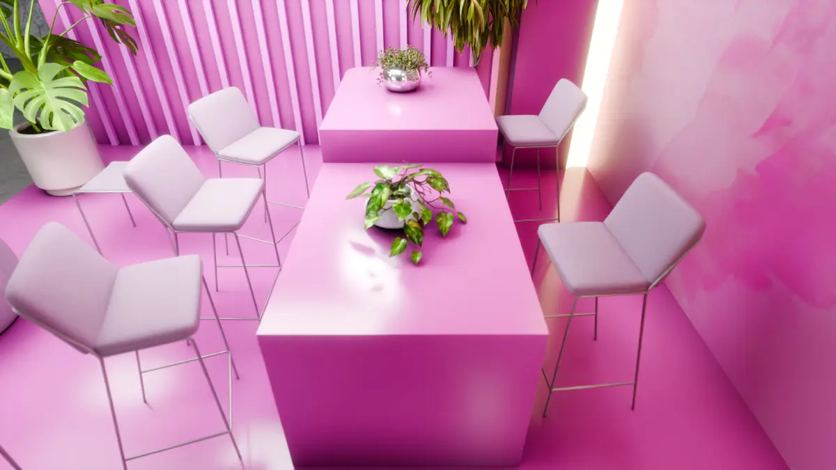 Glossy pink floor with perimeter lighting adds a polished, high-end finish