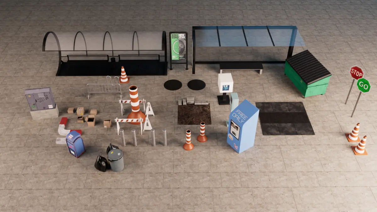 This is a high-quality low-poly 3D urban props pack, fully optimized for real-time applications, video games, AR/VR and production scenes. The collection includes various detailed city assets such as street furniture, garbage bags, traffic cones, mailboxes, signs, boxes, barricades, and bus stop elements.