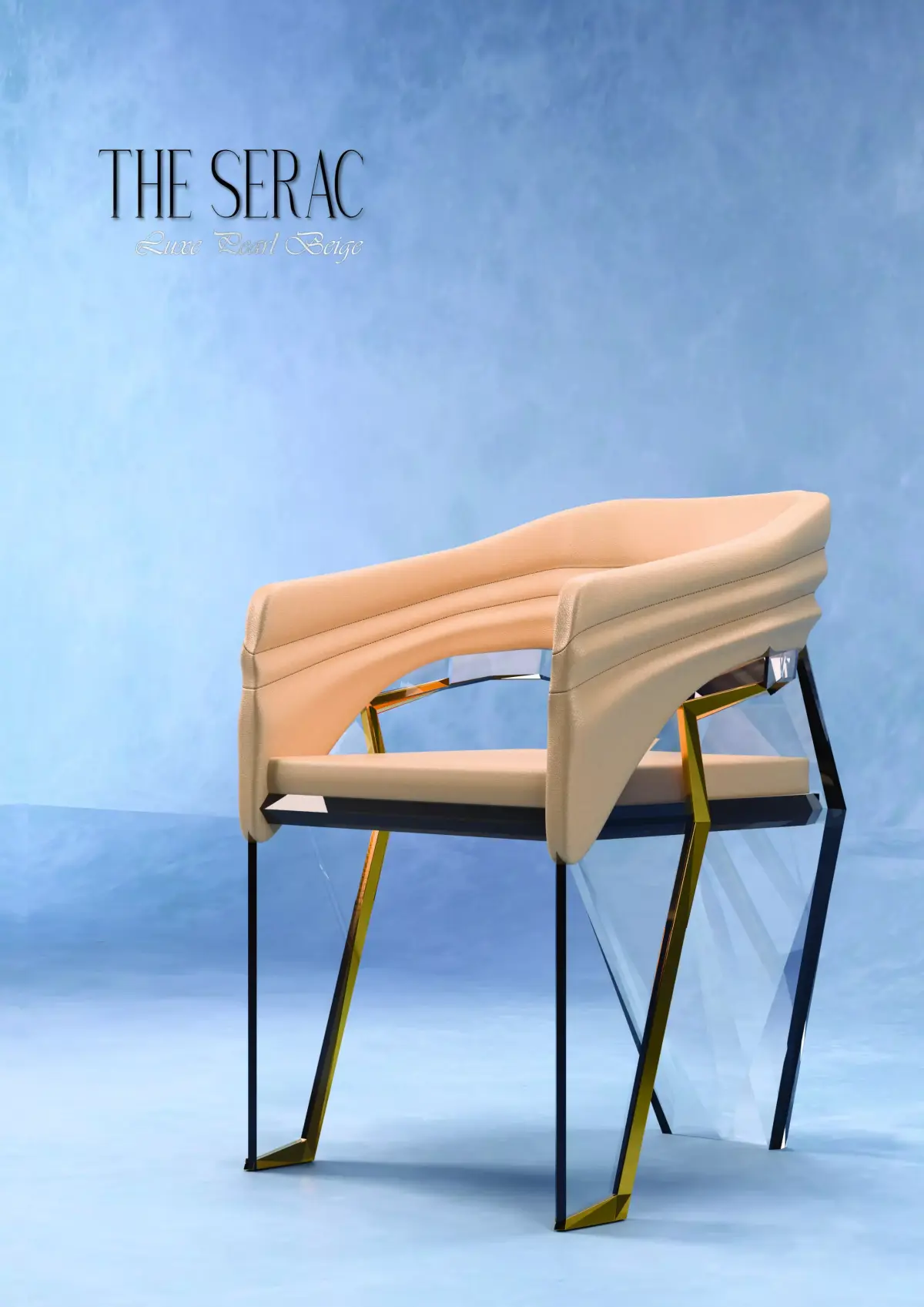Supporting this soft volume is a striking structural base that echoes the clarity and precision of ice. Faceted transparent legs appear almost weightless, allowing light to pass through while revealing the chair’s architectural logic. Slim gold-toned metal accents act as structural connectors, adding warmth and a quiet sense of luxury while reinforcing the chair’s stability.