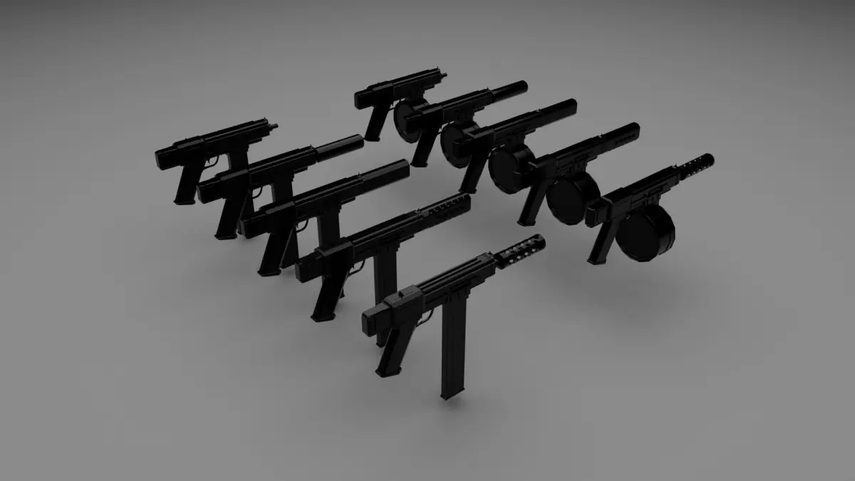 Low-poly semi-automatic weapon designed after Tec-9 with additional parts for modifications.
