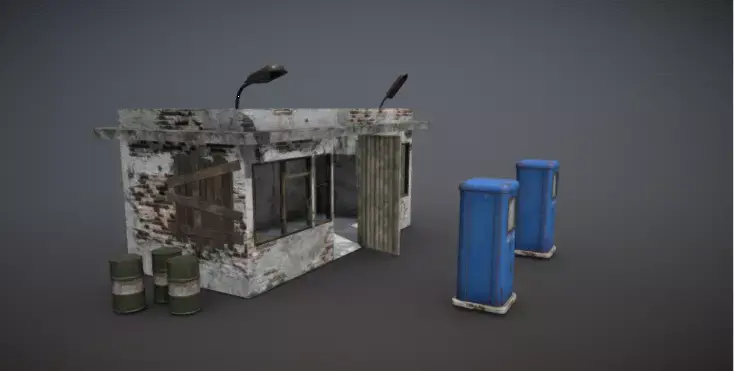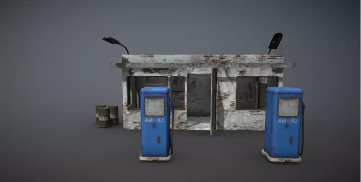 This highly detailed 3D abandoned gas station model captures the haunting charm of a forgotten roadside stop, meticulously designed with realistic weathering, peeling paint, cracked concrete, and rusted metal textures. The structure features broken windows, faded signage, worn-out fuel pumps, and scattered debris, creating an authentic post-apocalyptic or neglected small-town vibe. Advanced PBR materials bring out lifelike surface imperfections, from subtle grime buildup to corroded metal edges, ensuring striking realism in both daylight and moody nighttime renders.