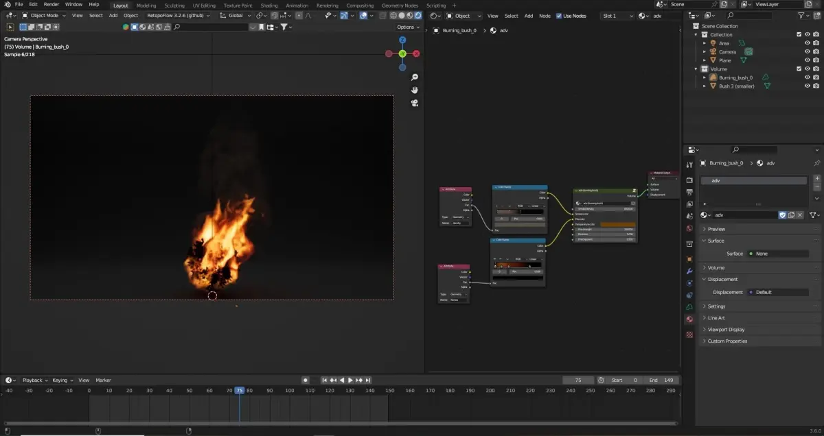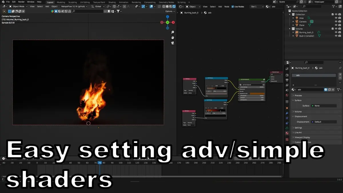 High-Resolution Burning bush in Blender: In the Blender file, the High-Resolution Burning bush is presented as a High-Resolution Burning bush. The file offers two shader options: simple and advanced. These shaders allow for easy customization of various aspects, such as color and other settings. Users can effortlessly modify the shaders to achieve the desired visual effect.