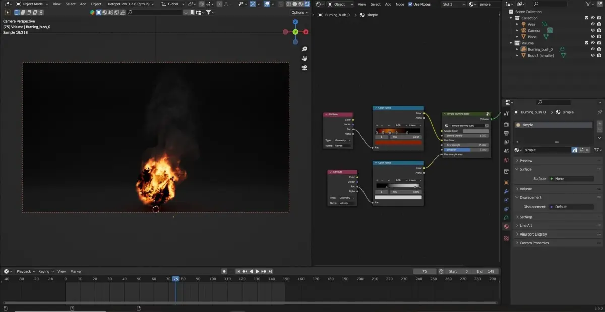 Attributes: The animation includes three essential attributes: flames, velocity, and density.