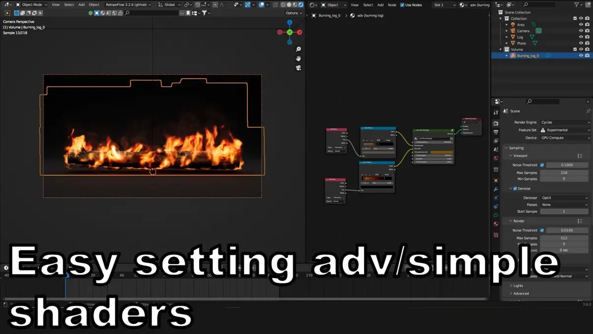 High-Resolution Burning log in Blender: In the Blender file, the High-Resolution Burning log is presented as a High-Resolution Burning log . The file offers two shader options: simple and advanced. These shaders allow for easy customization of various aspects, such as color and other settings. Users can effortlessly modify the shaders to achieve the desired visual effect.