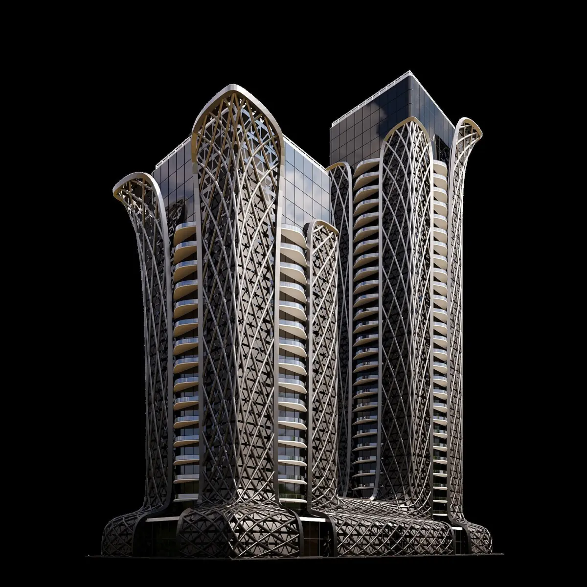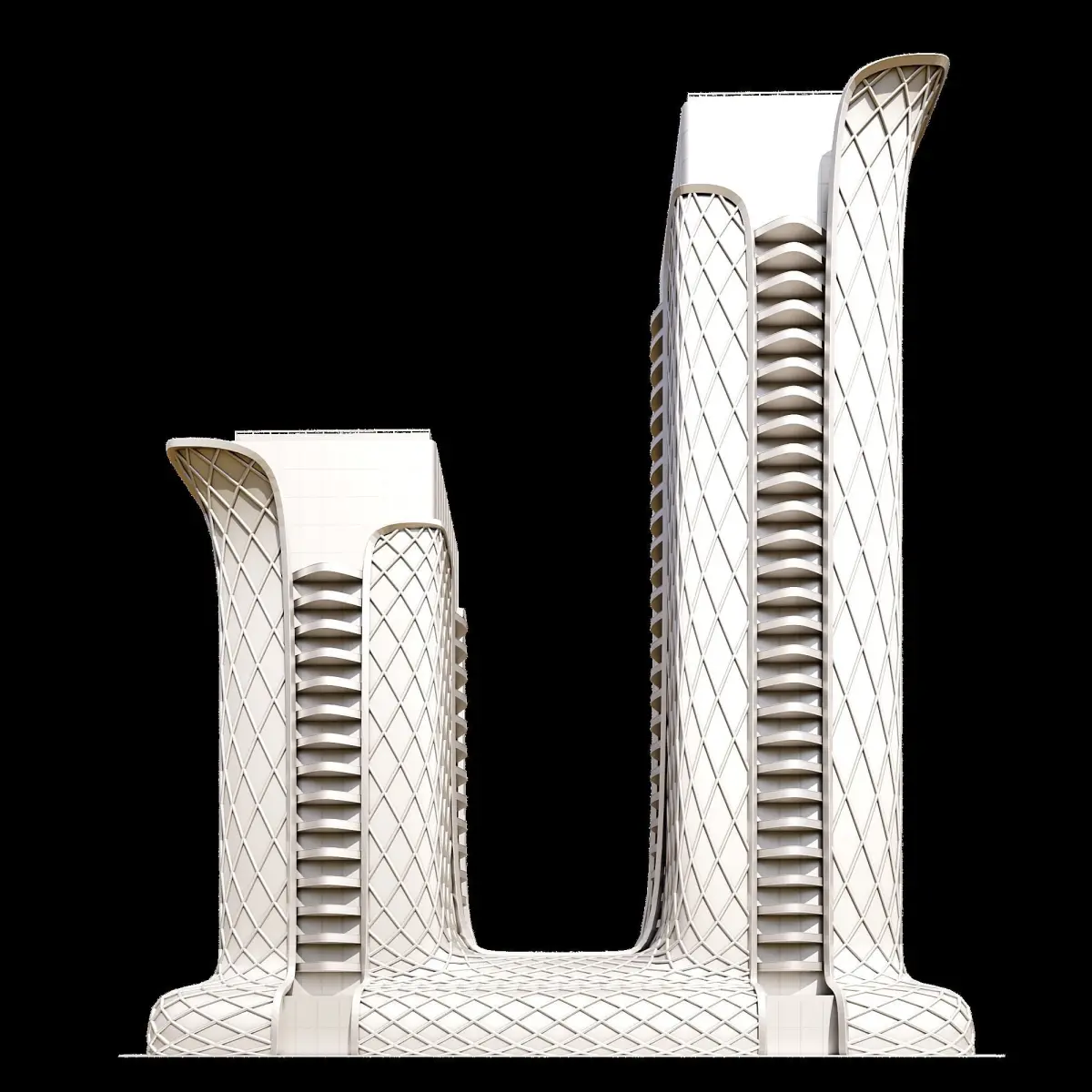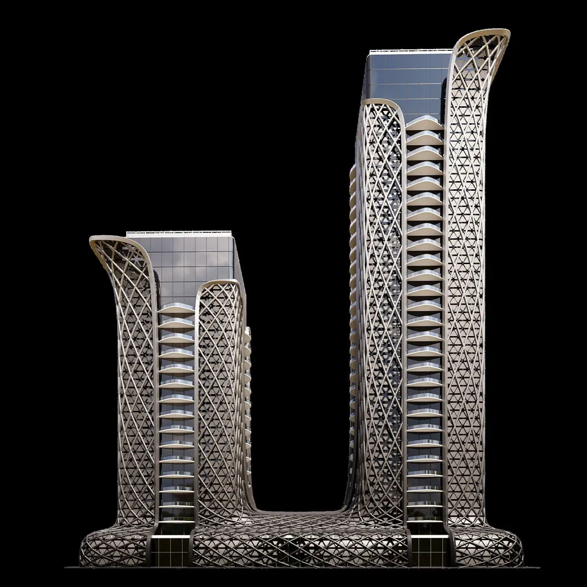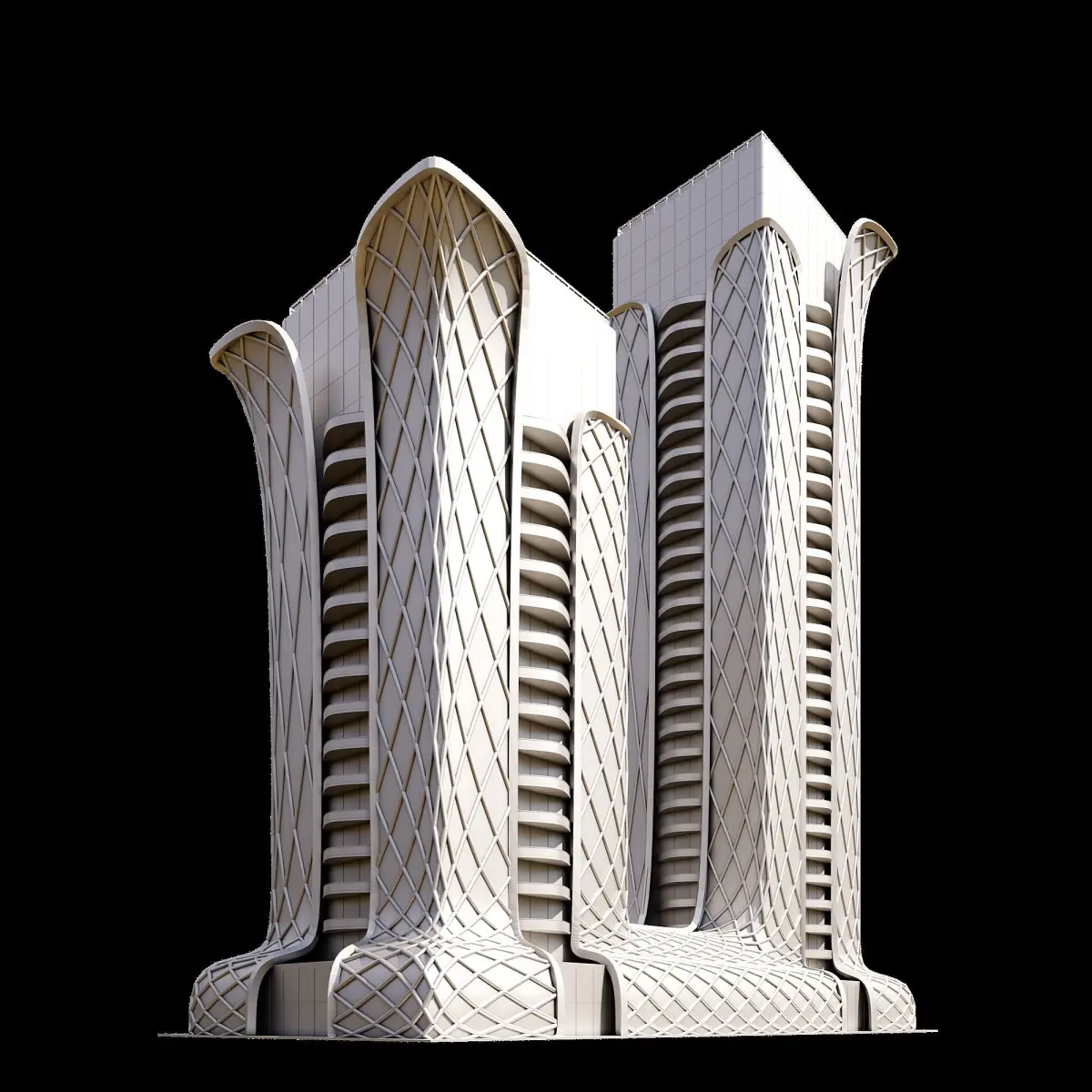 This is a 3D model of a modern architectural structure consisting of multiple towers. The towers are characterized by their sleek, elongated forms and intricate lattice exteriors. The lattice structures create patterns that add visual interest and complexity to the design. Each tower varies in height, with the tallest one positioned centrally, creating a focal point. The top of each tower is curved outward, adding an organic touch to the otherwise geometric design. Dark materials are used for the base and upper sections of the towers, contrasting with the lighter lattice structures. The image shows a detailed view of the 3D model from a distance, with the towers arranged in a symmetrical pattern. The model appears to be designed for a modern urban setting, with its futuristic and elegant appearance.