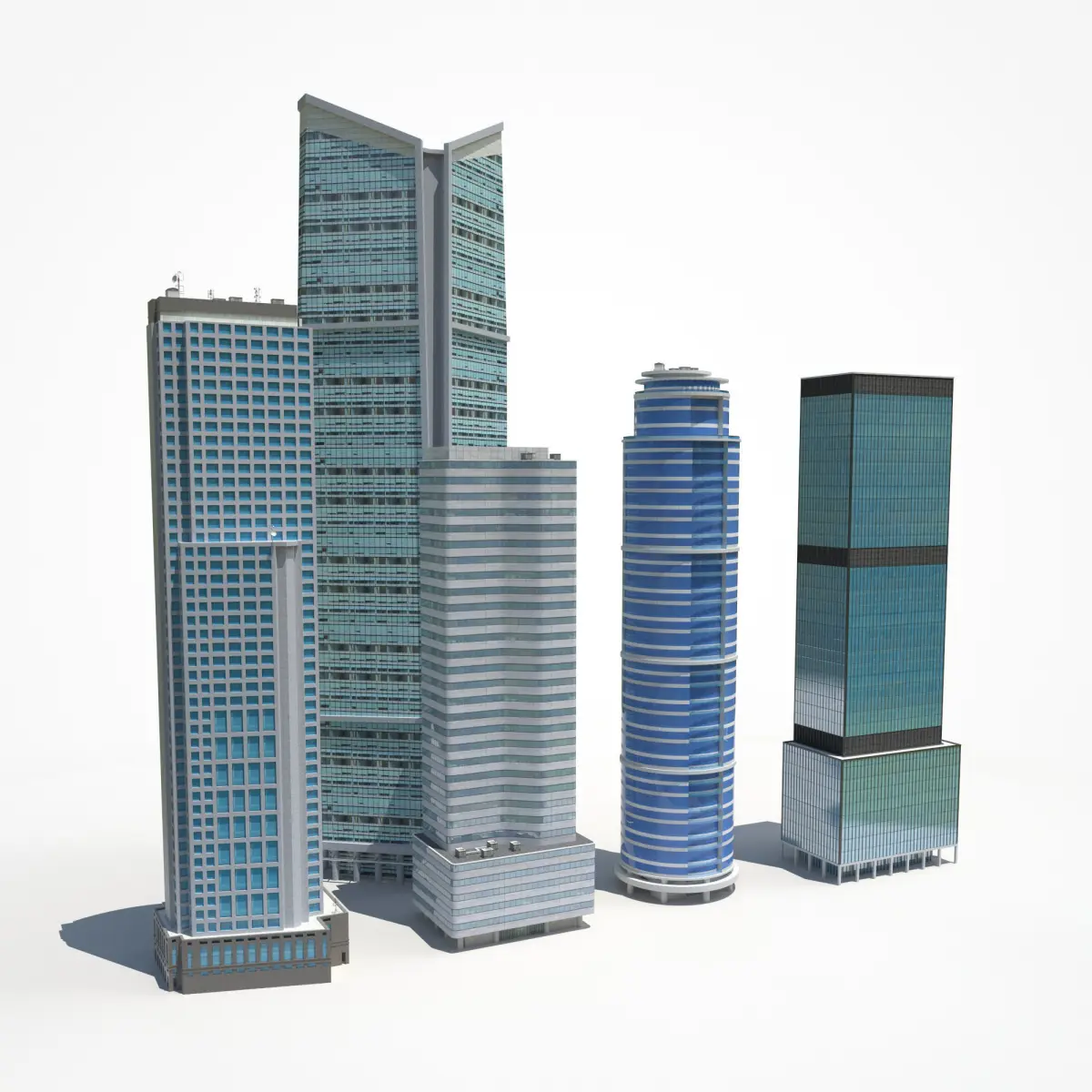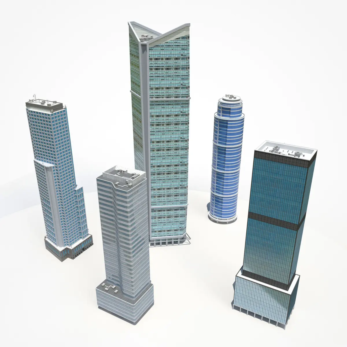 Low poly 3d models of 5 Skyscrapers buildings with roof detail.Great as background or Game Environment. Textures: Diffuse, Specular, Bumpmap for all Materials. Roof element with PBR materials Product's features: