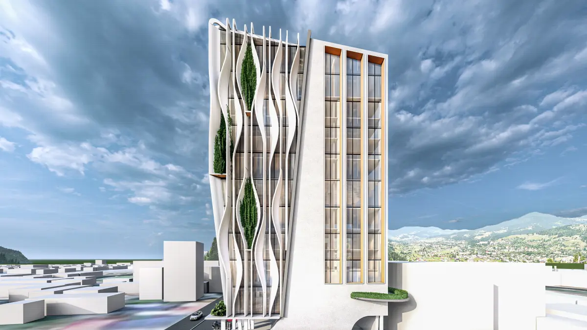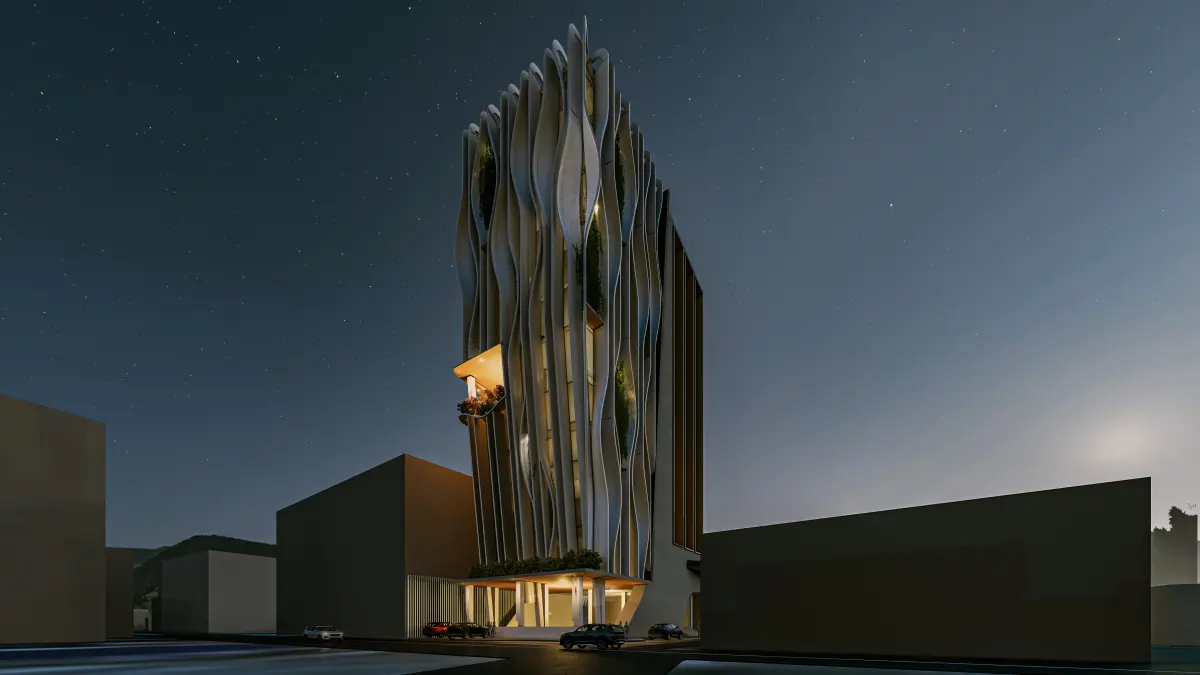 This detailed 3D model presents a striking mixed-use high-rise tower designed for commercial and hospitality purposes. Featuring a unique sculptural façade with vertical flow-like fins and integrated green elements, this concept blends contemporary aesthetics with sustainable urban design. Perfect for architects, visualizers, game developers, and planners, this model is optimized for both photorealistic rendering and real-time applications.