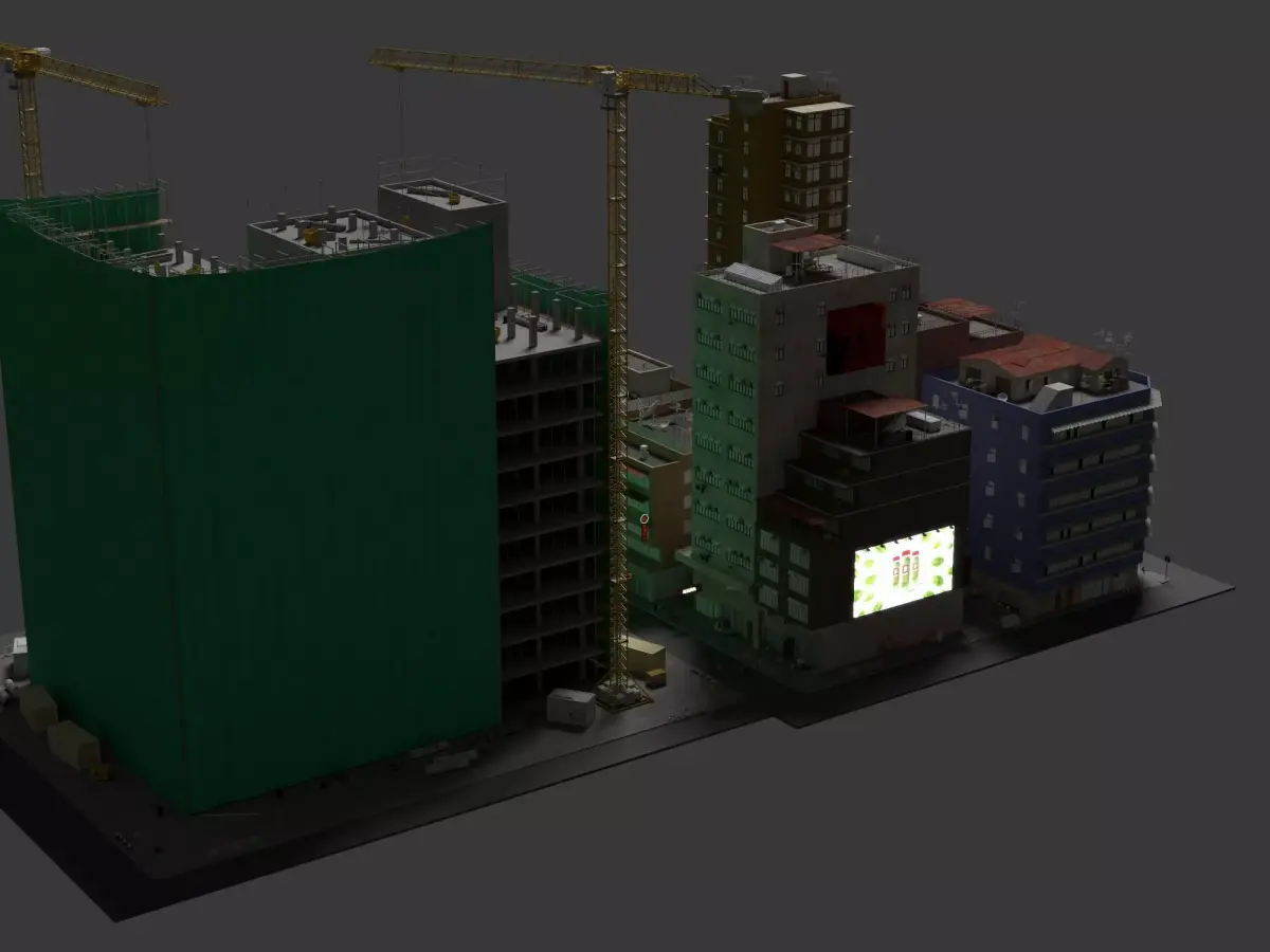 Realistic 3D model of a high-rise building in the late construction phase. Features two tower cranes, concrete frame with green protective netting, partially completed floors, scaffolding, site equipment, materials, surrounding mid-rise buildings, and urban context details.Perfect for architectural visualization, construction progress animations, BIM presentations, urban development scenes, real estate marketing renders, and game environments.Key features:• Real-world scale and accurate details• Clean topology, easy to modify• Suitable for close-up and wide shots• Organized objects with proper namingAvailable formats: 3DS, OBJ, FBX (plus others in files tab). Materials and textures included.