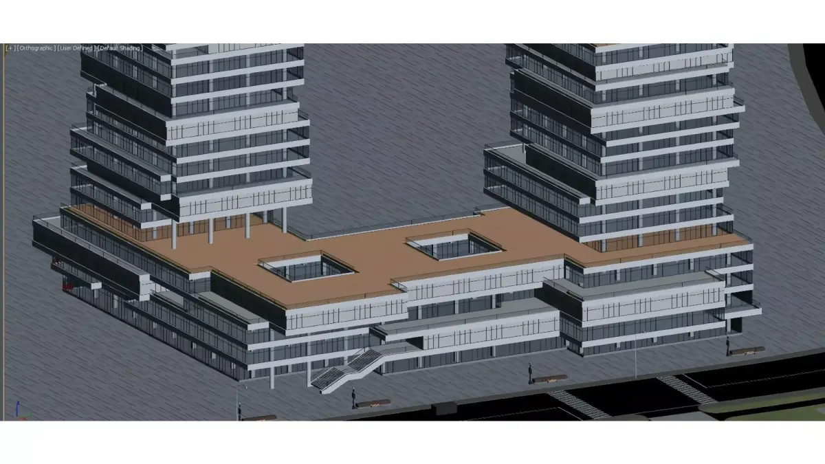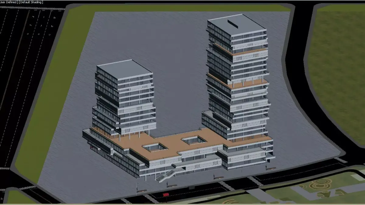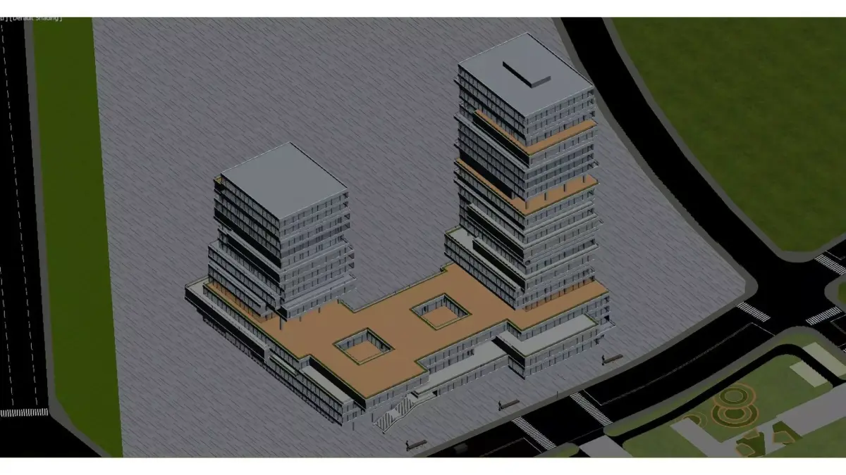 This is a set of architectural renderings adopting a modern design style, forming a commercial complex in the form of two high-rise towers plus a podium building at the base.A large number of glass curtain walls and white lines are applied to the building facade, presenting a concise and grand modern texture.The podium building on the ground floor is planned as commercial space, combined with open public areas, which is suitable for multiple urban functions such as office and commerce.The overall shape is stylish and iconic, showing the modernity and vitality of urban architecture.