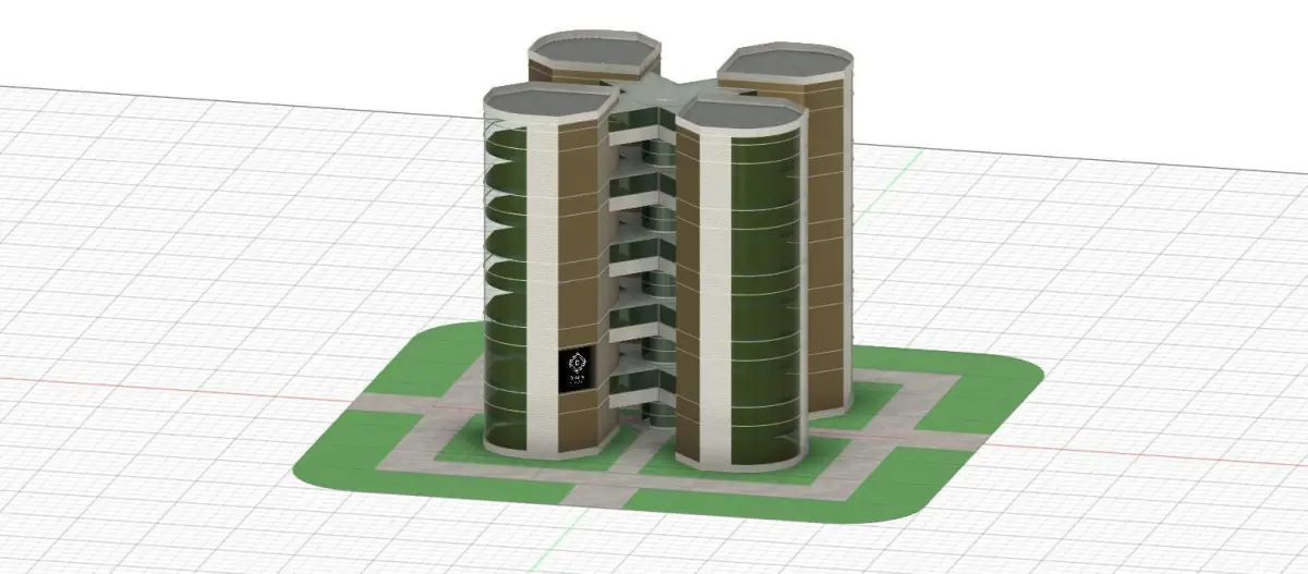 This High Rise Office Space Building contains a 10-floors utilizing various materials. The design contains 4-towers and a central elevator system.