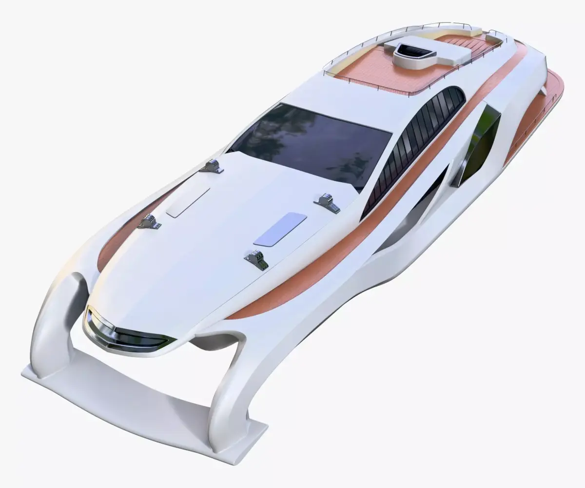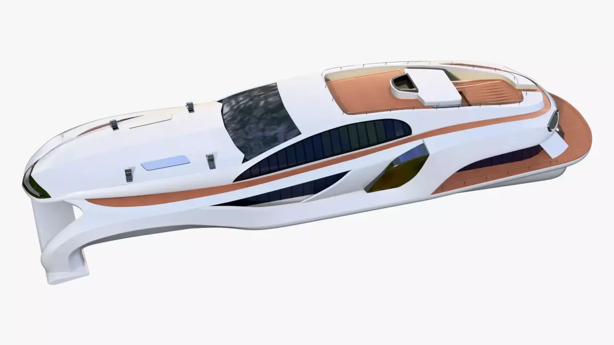 A white, aerodynamic luxury yacht, adorned with wood, featuring panoramic glazing and a high, unique, raised bow styled after a luxury car.