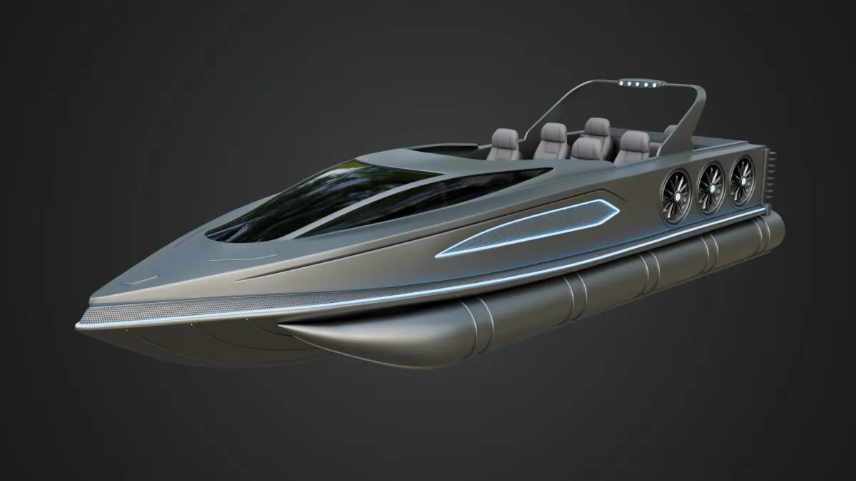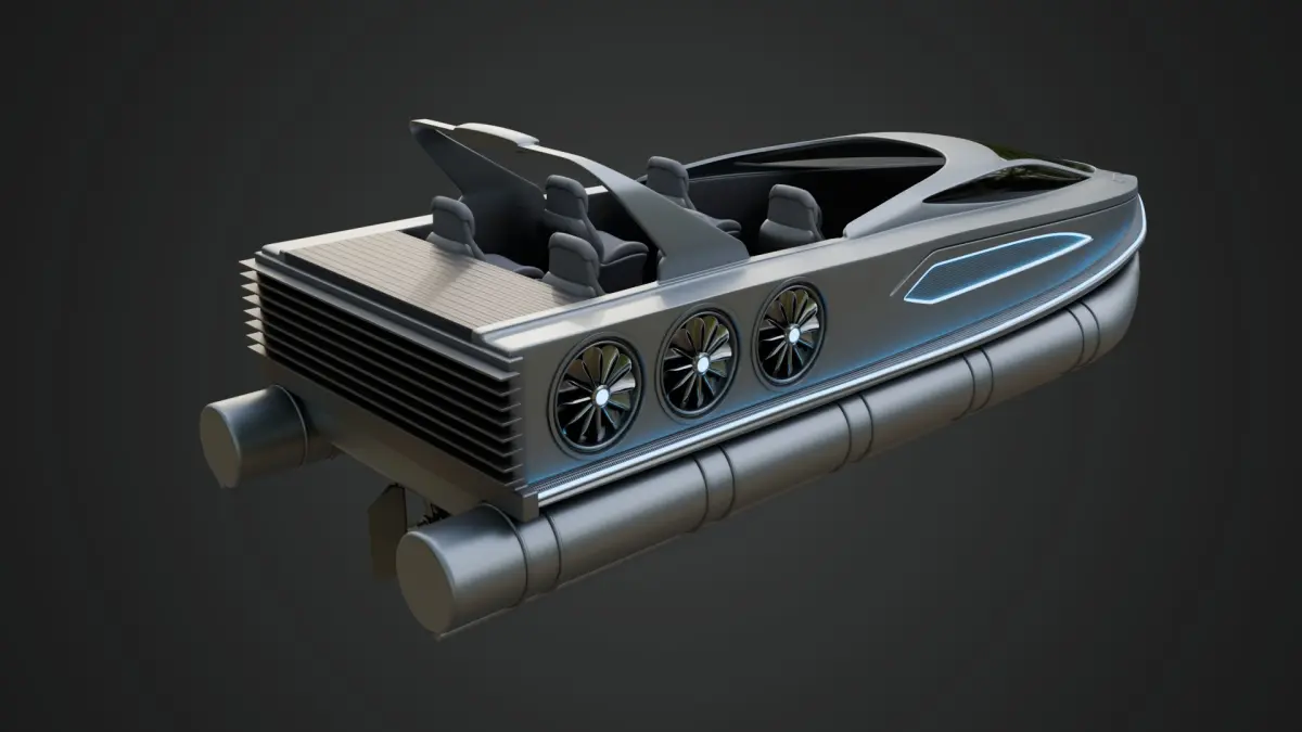 A sleek and futuristic high-speed performance pontoon boat with a metallic silver exterior, equipped with advanced propulsion technology and streamlined design elements, perfect for cruising on the waterways of the future.