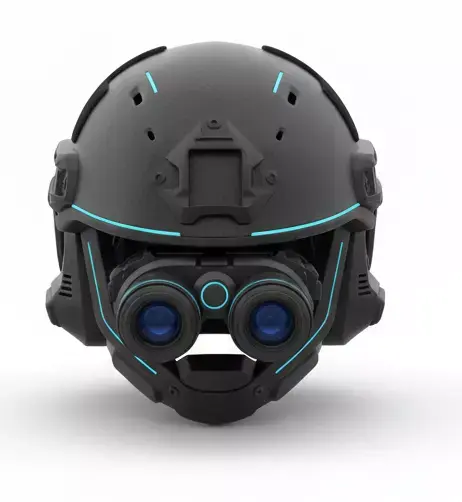 The signature element is the modular, articulated dual-lens night vision goggle (NVG) system, which features bright, blue-tinted lenses and is mounted to the front. This system is reinforced by a structural arm that integrates seamlessly into the helmet, emphasizing a dedicated stealth aesthetic. This model is perfect for elite snipers, reconnaissance specialists, or technologically advanced security forces.
