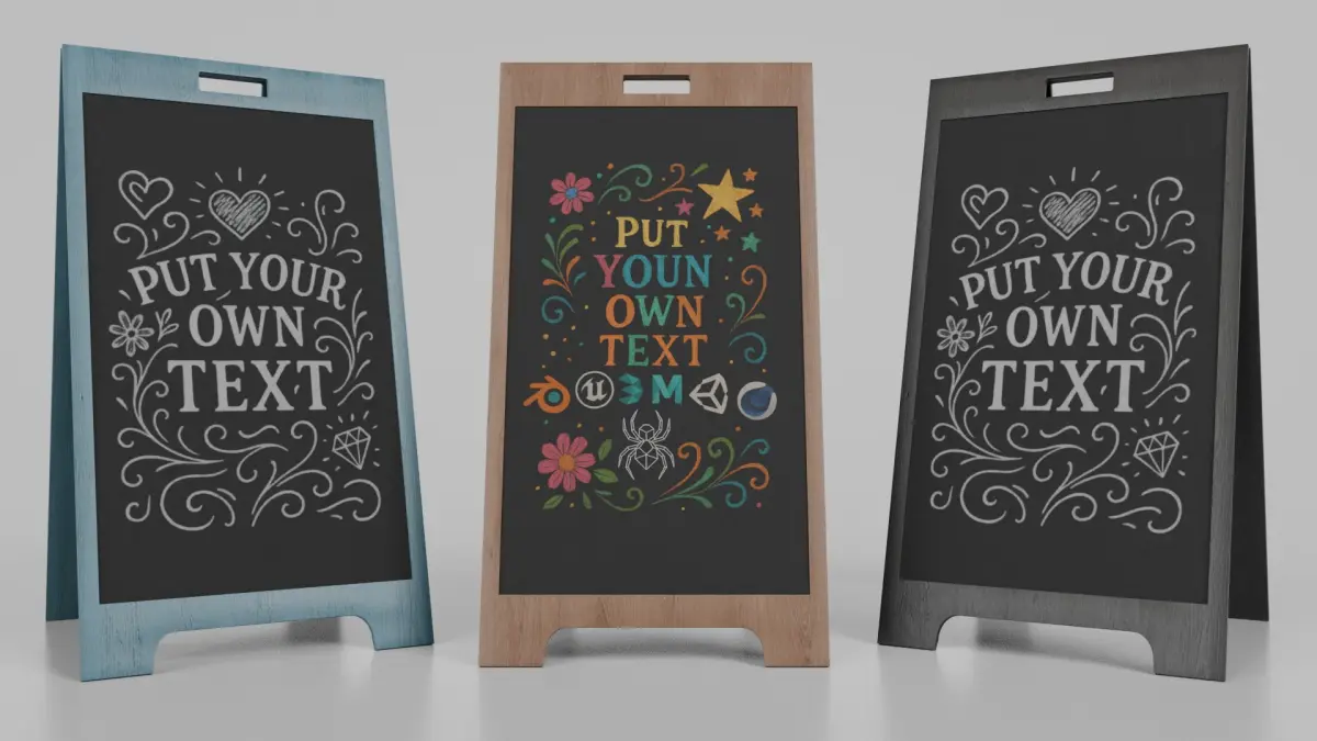 A professionally curated set of high-quality 3D chalkboard assets, combining six chalkboard models, including customizable sidewalk signs, countertop displays, and wall-mounted boards. Designed for architects, game developers, and 3D artists creating realistic commercial, educational, or hospitality environments.