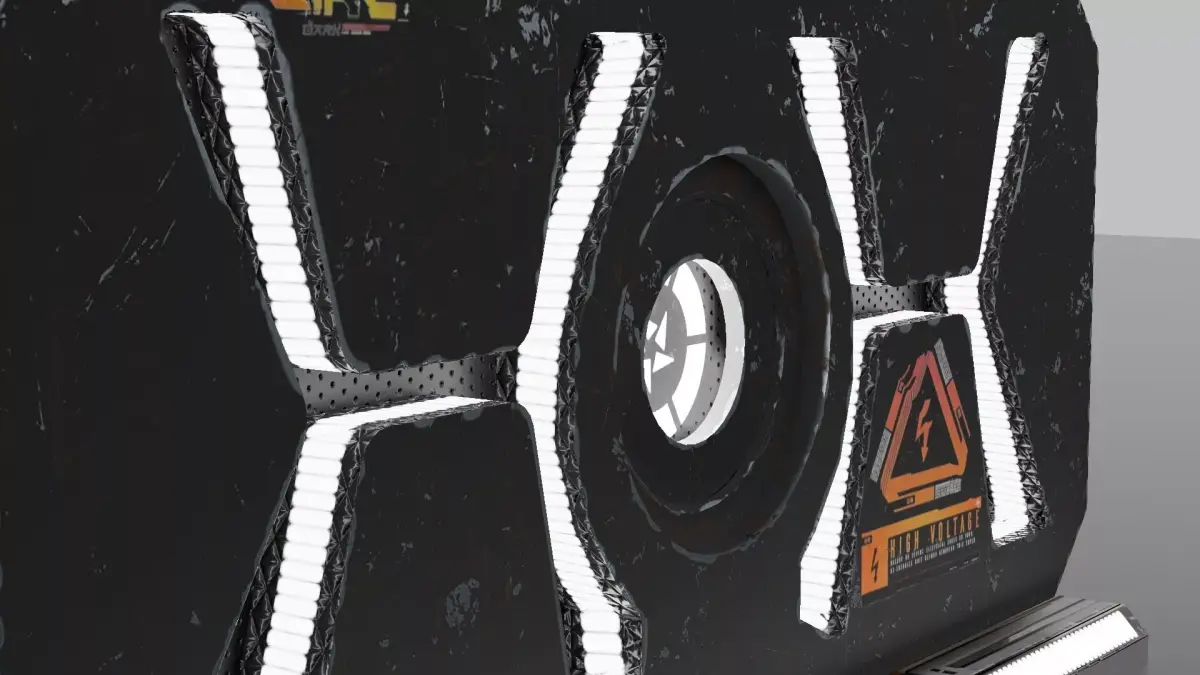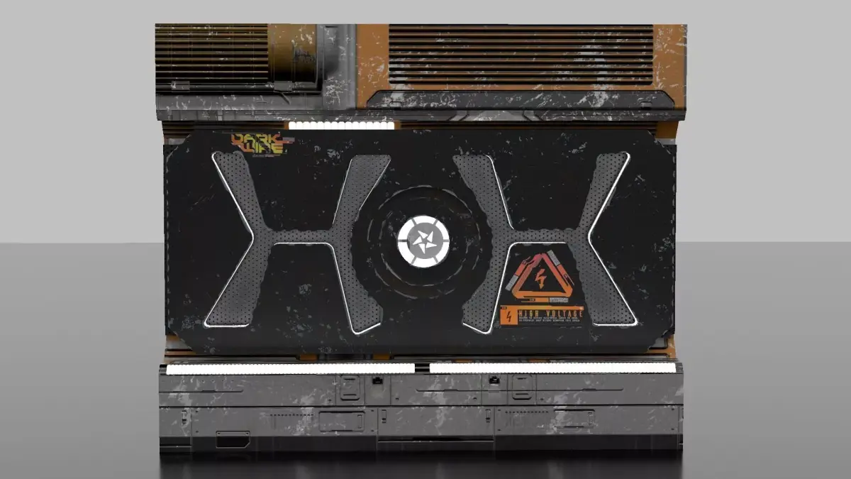 High detailed sci-fi industrial panel with glowing edges and high voltage warning sign.