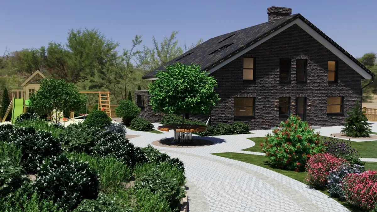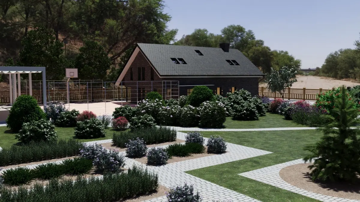 *Two exquisitely detailed connected houses*A meticulously designed garden path that invites exploration and fosters a sense of serenity.*Dedicated playground equipment*A designated basketball court*A curated collection of diverse foliage plants, majestic trees, and lush meadow grass, meticulously arranged to create a vibrant tapestry of nature.*A charming pergola.*A secure wood fence.