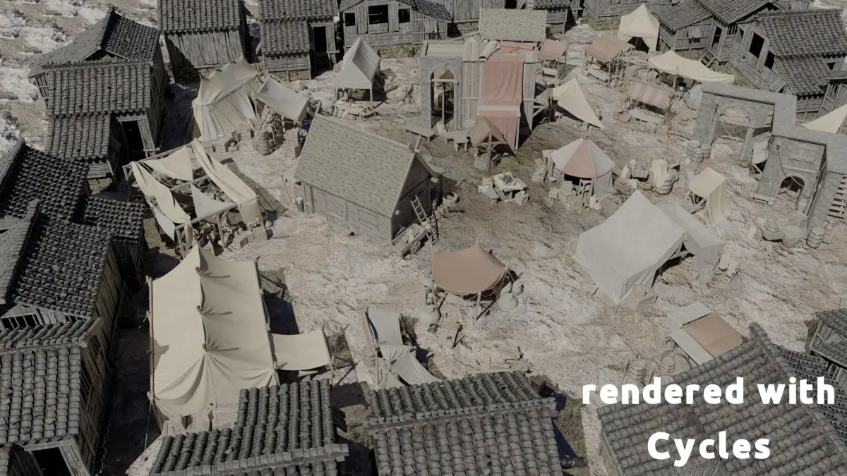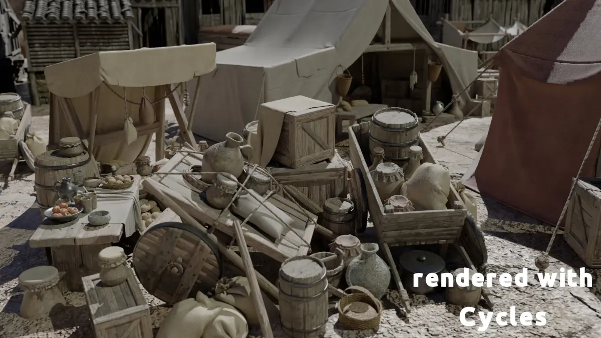 -technical detailsCreated on my pc (Graphics card: RTX 3060 12gb Vram) (CPU intel i5-12400F)(Ram- DDR-5 16GB 5200MHz) animation took about 1 hour consisted of 1000 frames with eevee render engine, if you bake all textures the reneder itself took about 1.3 seconds for 256 samples with legacy eeveeproject is complex containing 11.8m vertices 11.6m faces 22.9m Tris it requires minimum 8gb of ram although it sometimes hitches on my system of 16gb so more is probably for the bestBlend file contains textures.all 190 textures also included in a seperate 7z filethe scene is optimized for eevee but images containing the cycles logo in the bottom right corner are done in cycles and it looks fine too.some of the images are edited using photoshop both originals and edited are included.every stall has a subdivision sub surface modifer that u can use to add more details.(my settings are 2)all 7z files are compressed at ultra settings to make it easier to download but it takes a bit of time to decompress, dont freak out if it seem slow.blender may report some textures as missing but i intentionally removed them as they didnt add much to details and only made project extremly heavy that my 12gb of vram would crash dont worry about it.-final thoughtsthis project took a long time to make and all sort of feedback would be greatly appreciated.