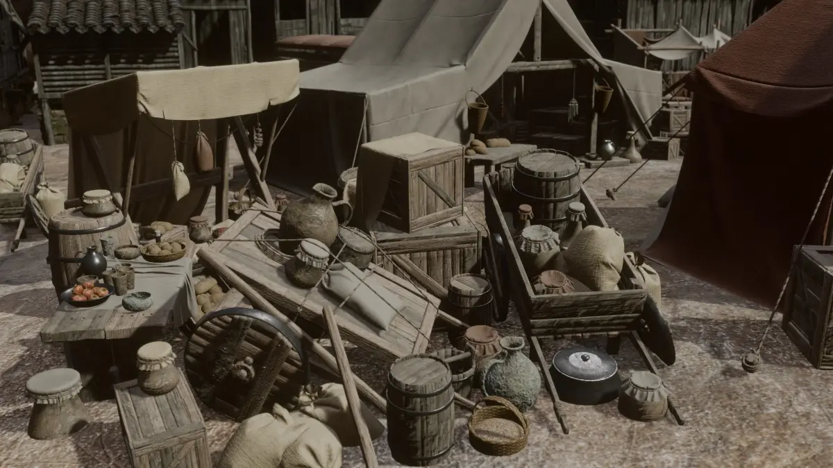 -project describitionImagine stepping into a bustling medieval town square, meticulously crafted in Blender and brought to life with the real-time rendering power of Eevee. The scene unfolds with a complexity that captures the essence of the era: a blacksmith’s stall where the clang of hammer on anvil rings out, a fishmonger’s corner with a fresh catch glistening under the morning sun, and a baker’s stand where the aroma of freshly baked bread fills the air.