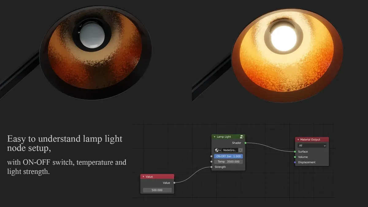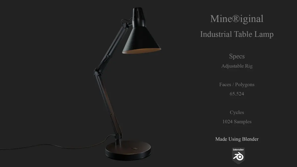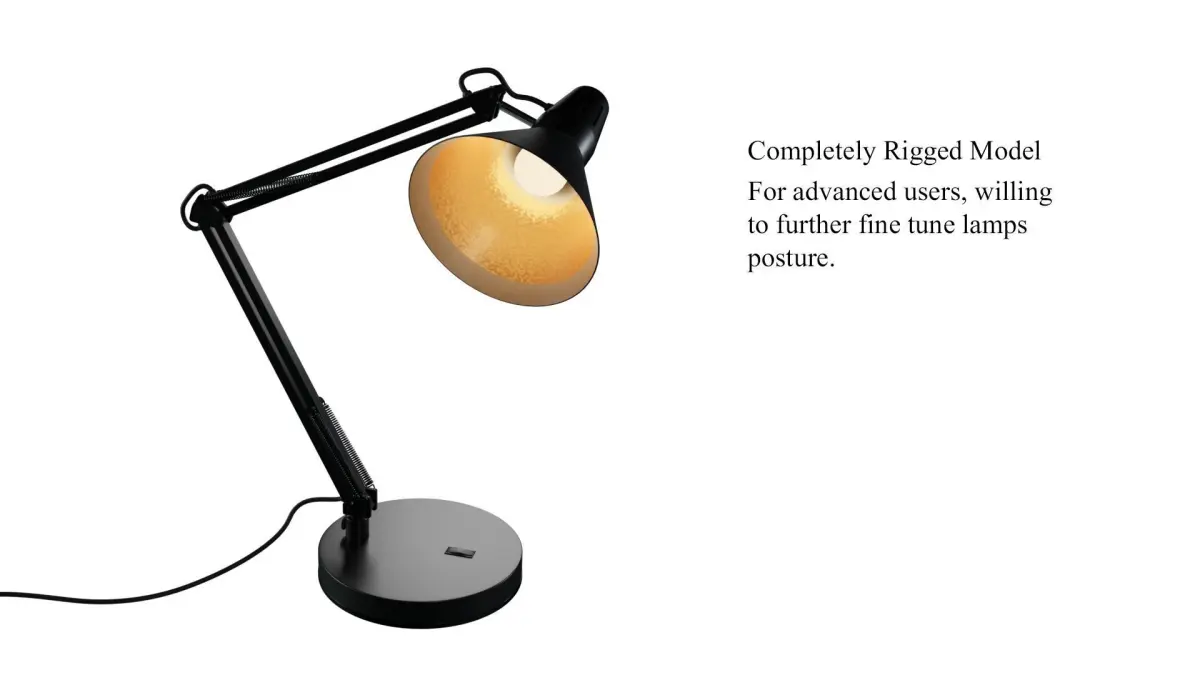 This is a highly detailed model, with attention given to every little detail.The lamp is modeled accurately and uses no external textures at all. All materials are procedurally generated within blender, therefore they will only be visible using blender.However those materials are simple and easy to create in other software of choise that allow material creation. The node setups were simplified in order to be modified withease, even from an unexperienced user and include some of the colors I used on the images. It's recomended that when using other colors for the main lamp material, thatthe metallic factor is set to 0, otherwise with some color combinations it might look strange.With the product there's also the original file of the model included, named MineOriginal Industrial Table Lamp - Rigged, that includes the rig.When I tried to add IK ( Inverse Kinematics ) I experinced some bugs, so its not a plug n play solution. In order to use it in a realistic way you should always view it form a side orthographic view ( using 1 from numpad ). I attached an image as a manual of how to use it. In both blend files I kept the able to move cables separated, so that users are able to edit their position and curvature to mach their scene.The other file formats are just exported from blender so you wont need to do it yourself. They re not edited in those formats, which means that they wont look as theydo when using blender.
