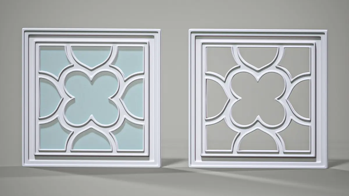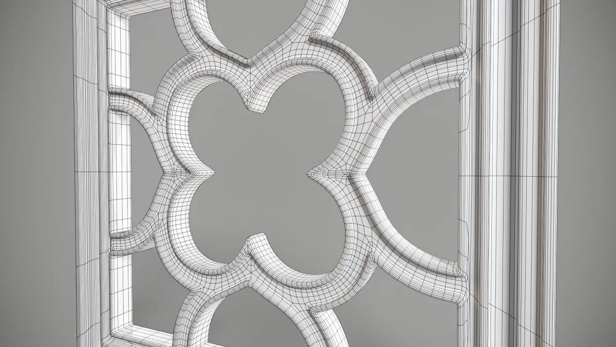 High poly, hard surface model of simple square Gothic window, with floral-like pattern formed by connecting circles. Dimensions 0.5x0.5 m. Subdivided with one iteration, ready for further subdivisions. 1st - model with double-sided glass. 2nd - empty frame