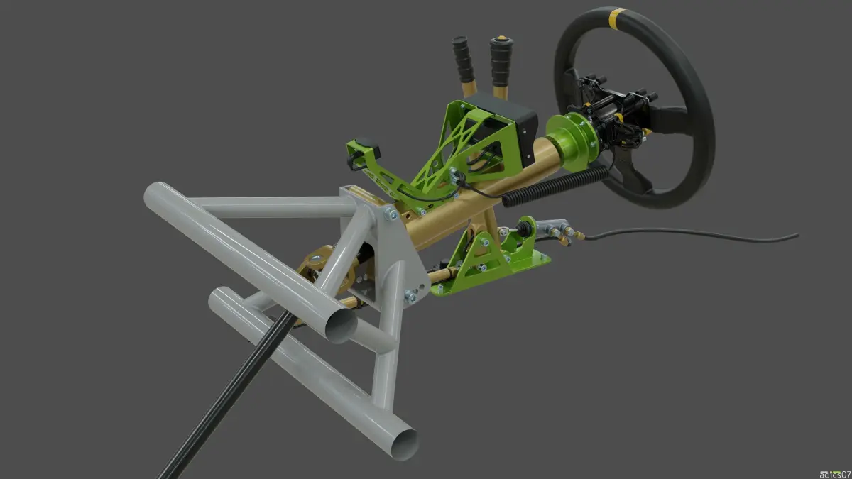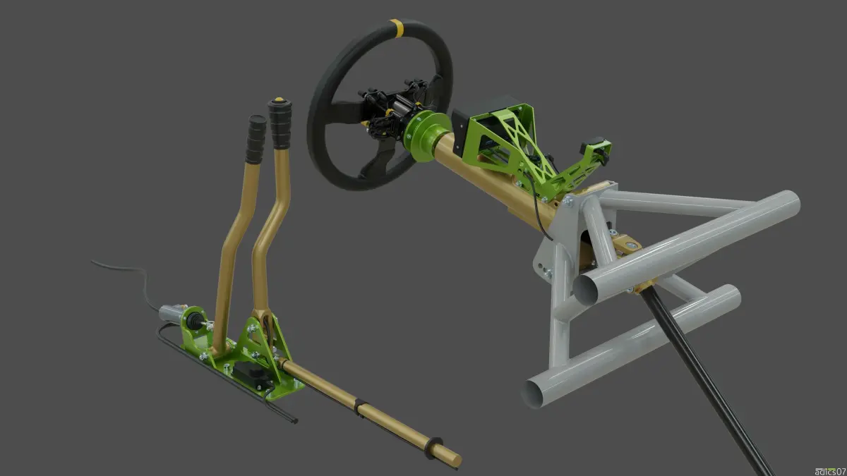 High detail 3D model of a steering wheel, gearshift and handbrake.