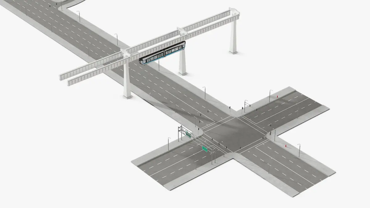 Highway and Suspended Monorail Air Train is a three-dimensional model of suspended monorail air train or suspended monorail sky train, designed for both commercial passenger commuting and sightseeing.