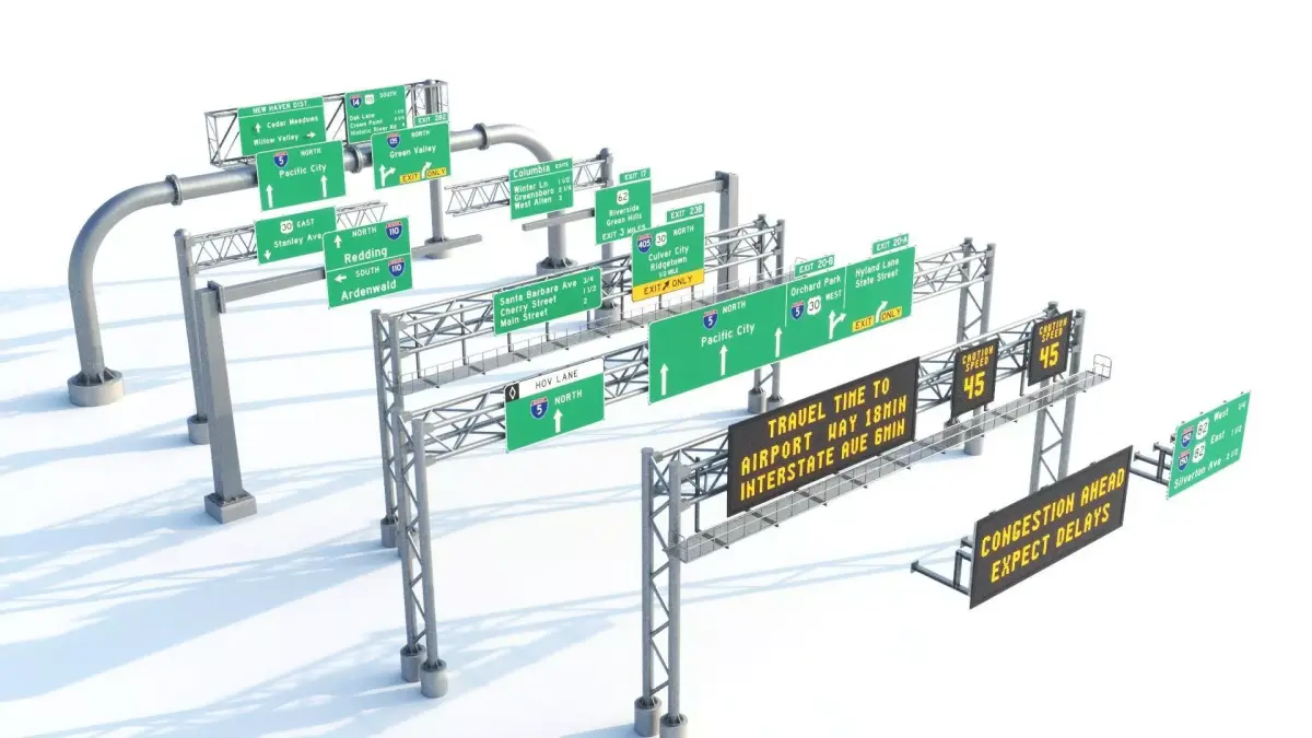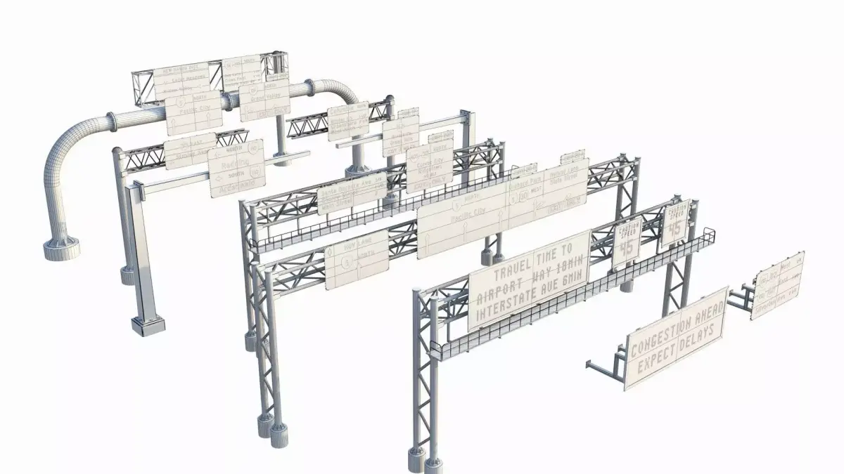 Most of the structures are left with symmetry modifiers in tact so you can shrink or enlarge the sign as well as the support structure to fit across a multitude of highway/roadway configurations