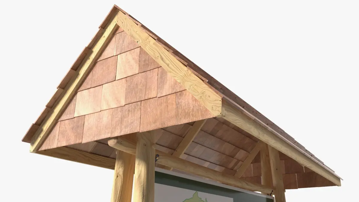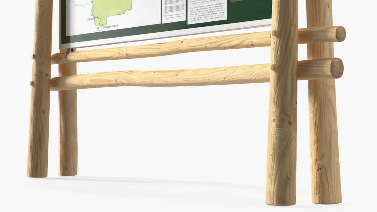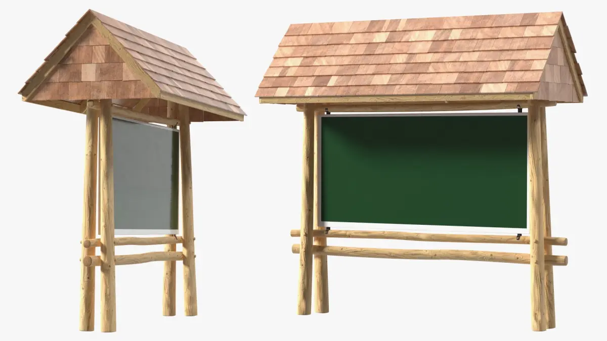 This model features a detailed wooden information board with a map showcasing various hiking trails. The board is covered with a roof made of wooden shingles, offering protection from the elements. A hiker dressed in outdoor gear stands beside the board, alongside a realistic backpack, adding to the scene’s authenticity.
