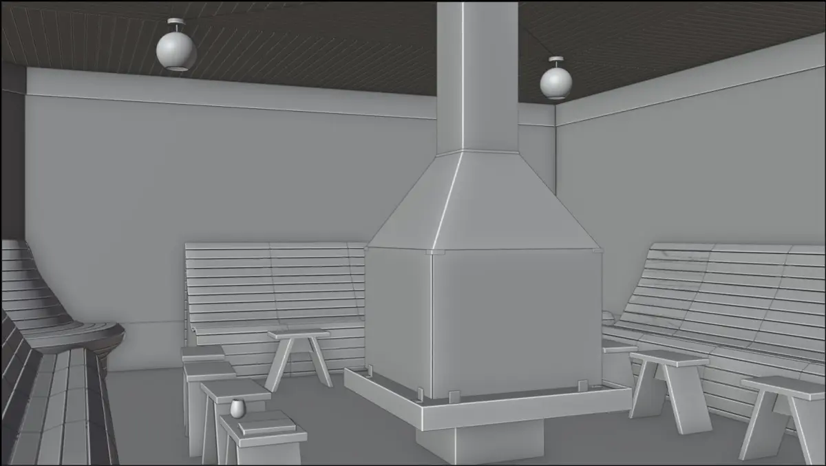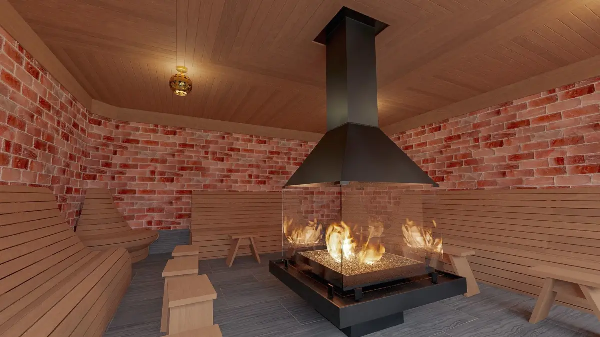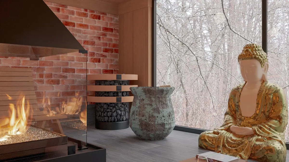 Salon Himalayan brick wallgas fireplace with glass rockswooden benchesbig open windowCedar all around