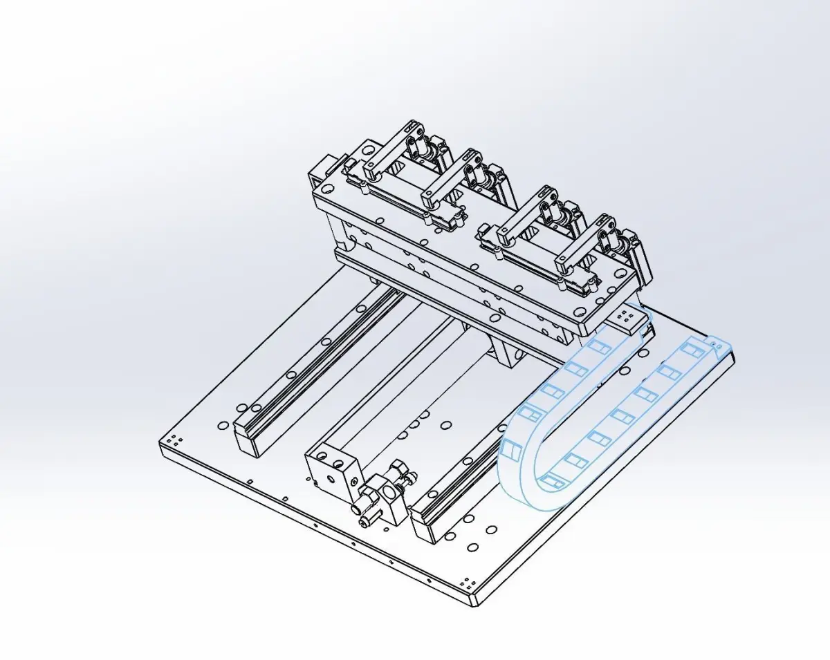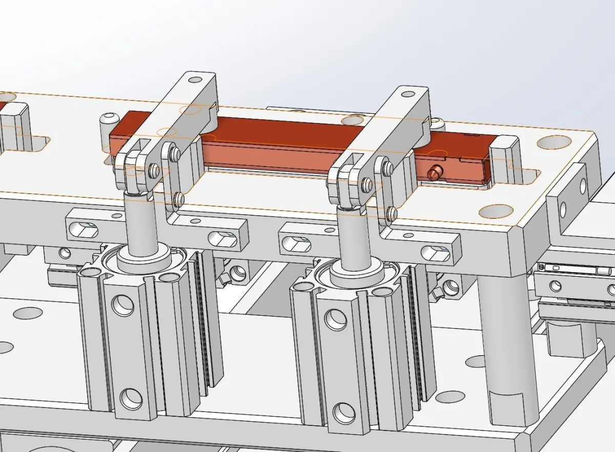 Hinge locating mechanism, the mechanism through a set of pneumatic cylinders double slide form the slider mechanism, at the same time on the sliding table is group of hinge point, through the cylinder and rotating hinge connecting form, it can be used in loading module, the product into the positioning fixture, cylinder push hinge press and hold the productmechanism include