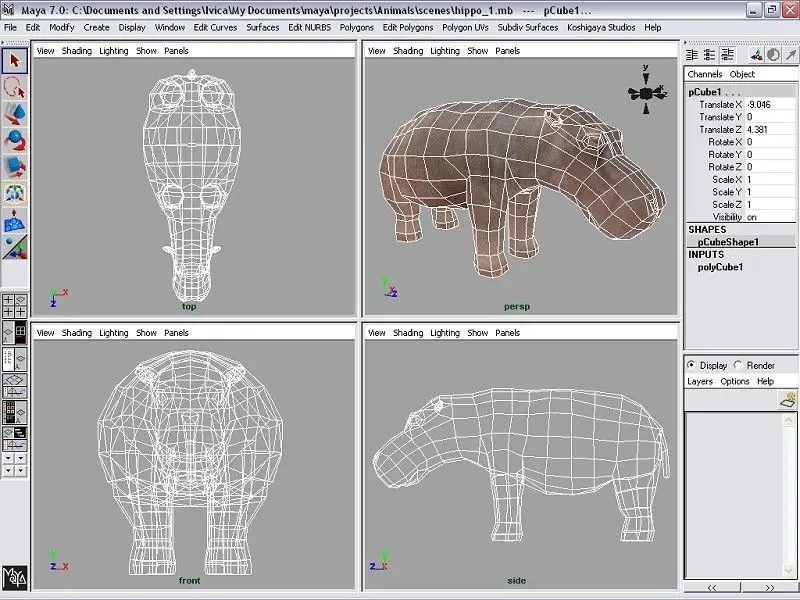 Hippopotamus model for games, educational, visualization and other purposes.UV mapped and textured, made with Maya 7.Maya 7 (.ma, .mb), OBJ (.obj), 3ds Max 2009 (.max) and Autodesk FBX (.fbx) format included.Polygons: 606 quads/ 1180 trianglesVertices: 594Edges: 1196UVs: 768Textures included in textures_hippo.zip file:-1024×1024 .jpg diffuse (color) map-1024×1024 .psd diffuse (color) map with layers