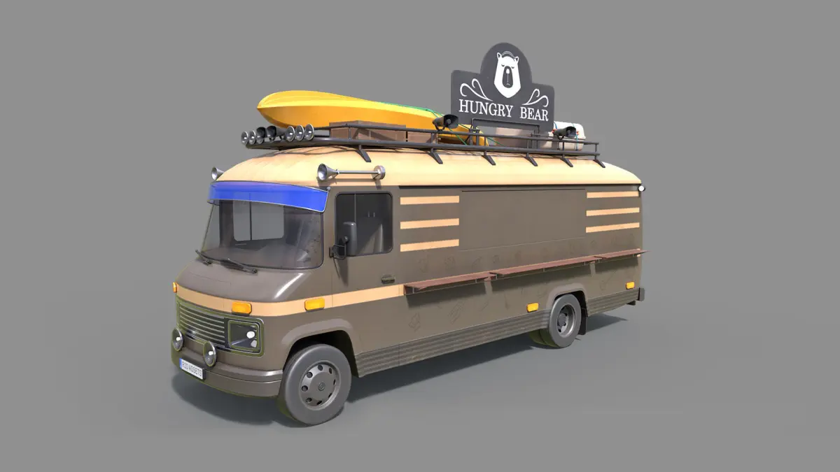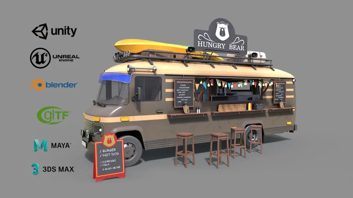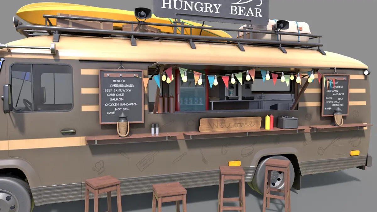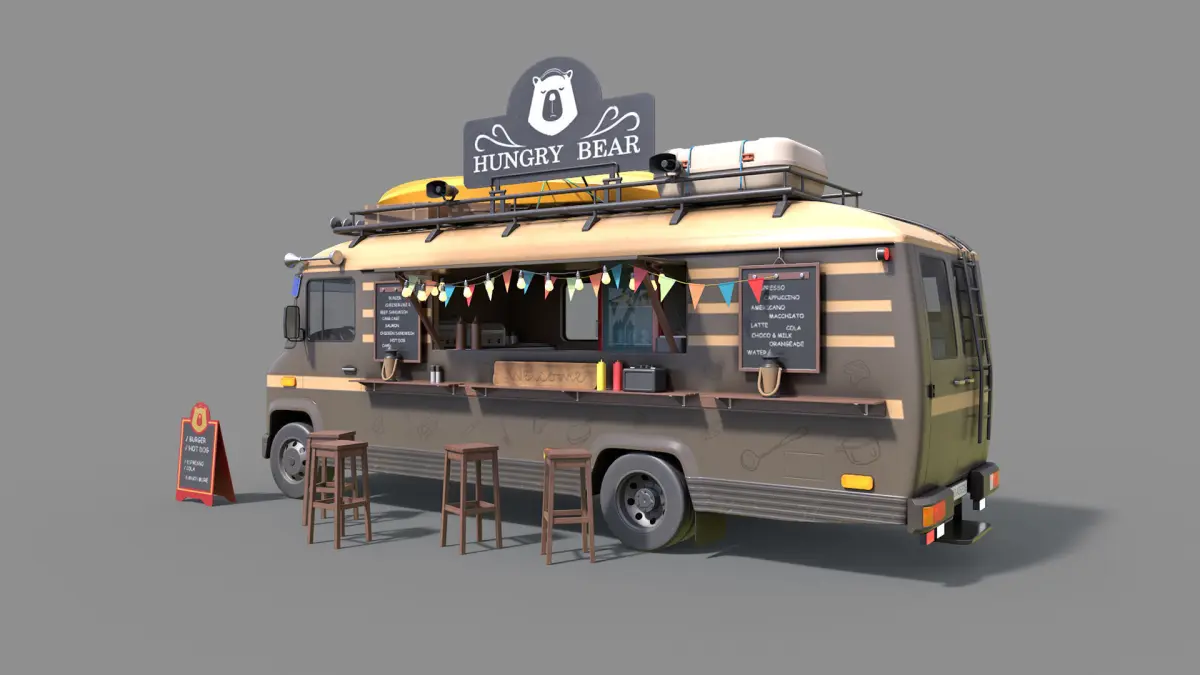 Low-poly PBR 3D model of Food Truck with an additional chairs and some almost ready to eat food:)