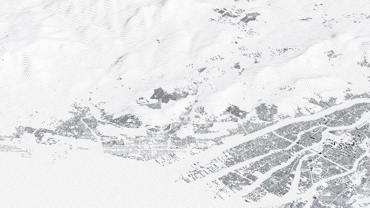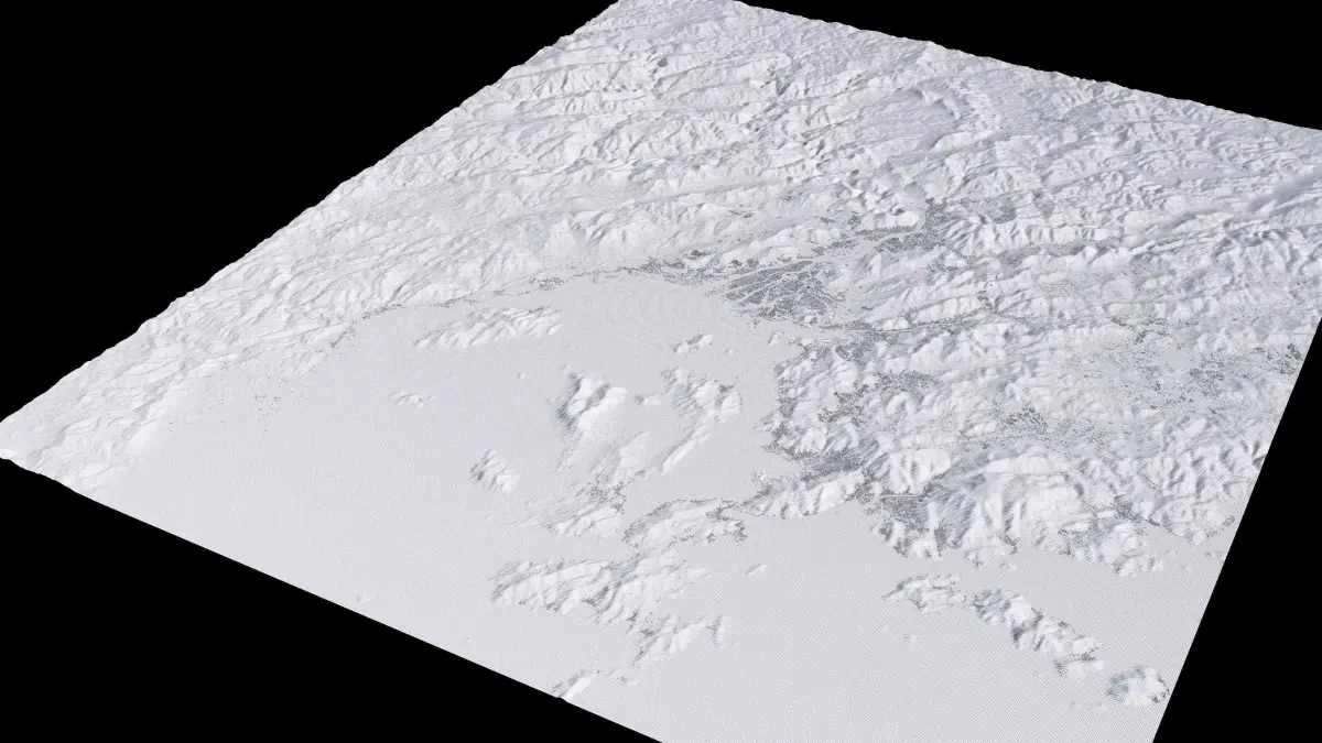Originally created in Houdini 19. Final images rendered in Houdini. Data source is ASTER GDEM V3, ASTER WATER V1, Open Streep Maps 2022, Copernicus Sentinel 2016.