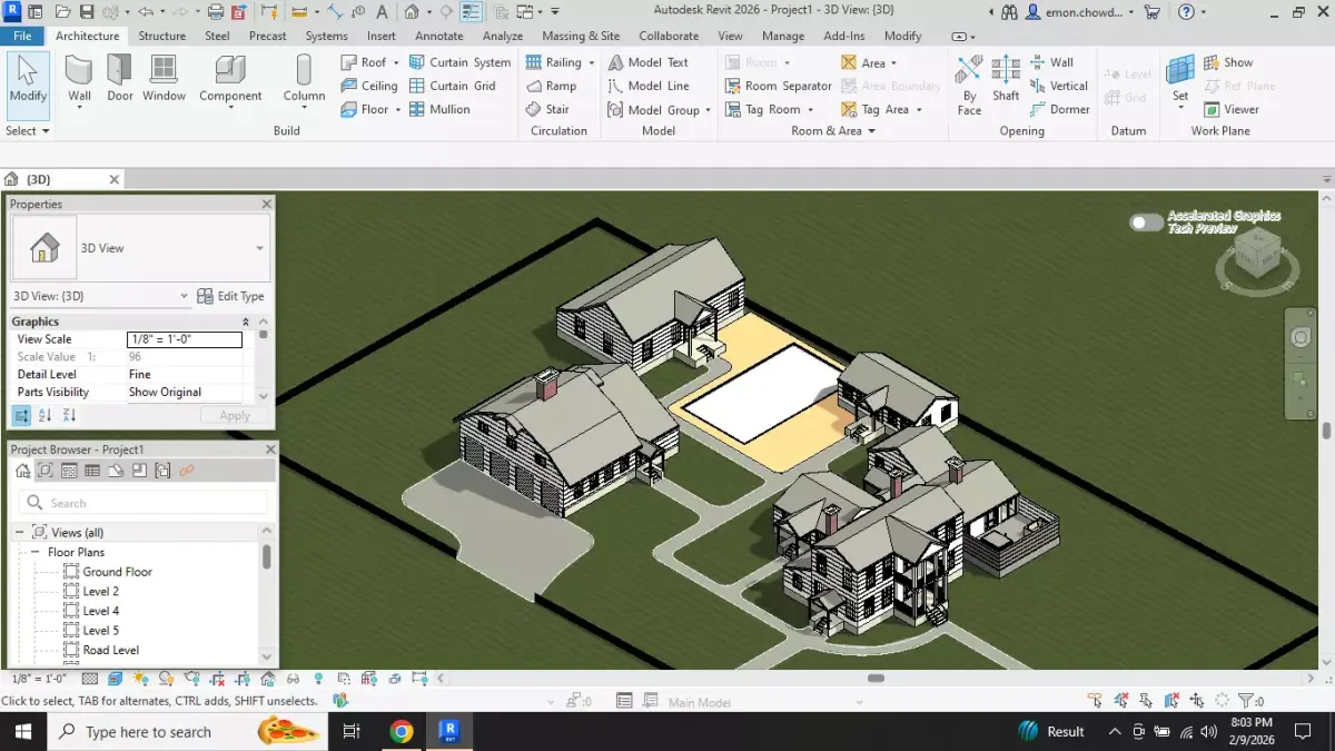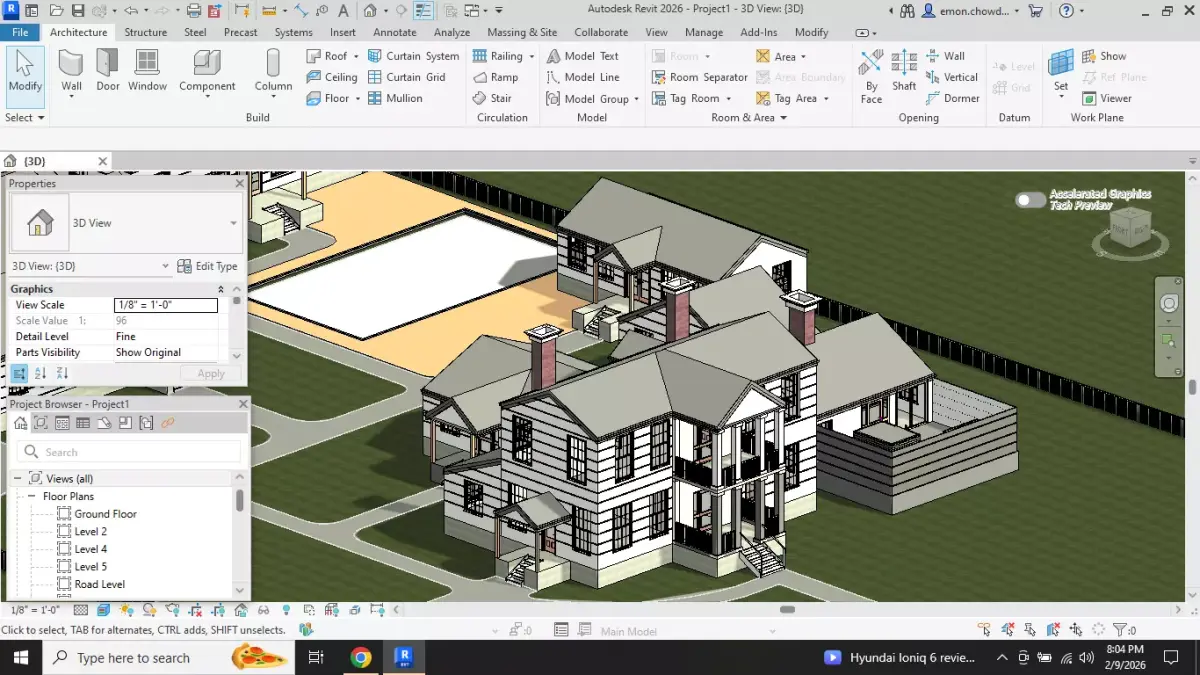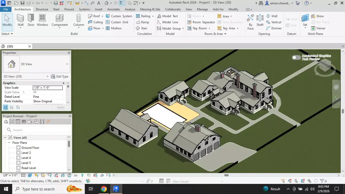 The barn is conceived as a secondary structure that reinforces the rural and historical context of the site. Its form, roof pitch, and material palette are inspired by traditional agricultural buildings, reinterpreted with contemporary standards for durability and efficiency. Together, the historic home, expansion, and barn form a cohesive architectural ensemble that balances preservation with modern use. The Revit 2026 model is developed with clear organization, accurate geometry, and clean BIM standards, making it suitable for visualization, documentation, and further design development.