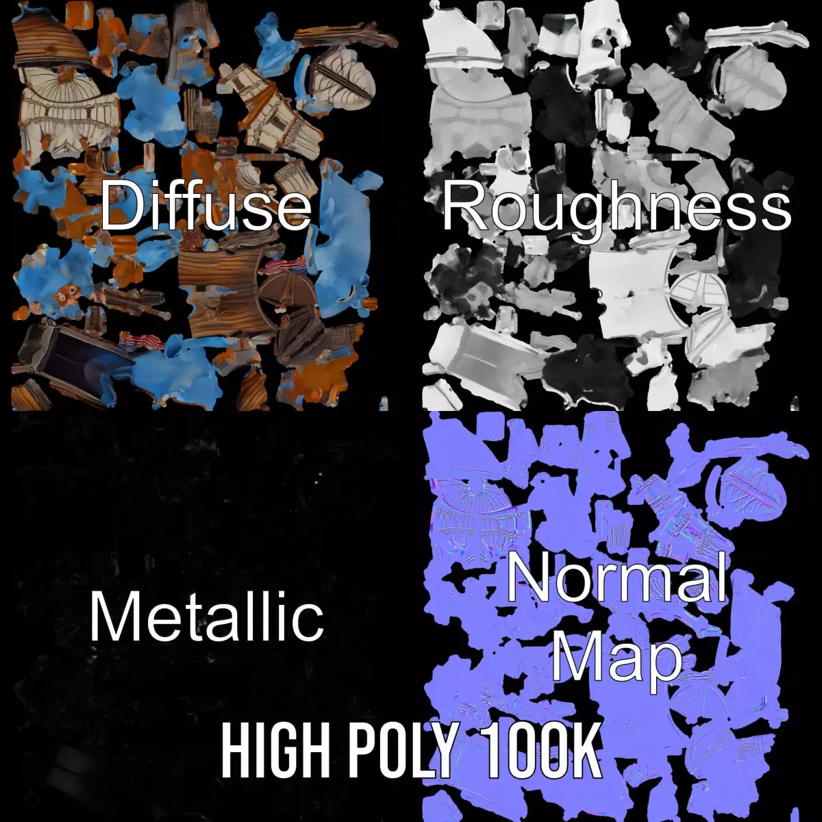 The model's textures are PBR, Diffuse, NormalMap, and reflection/roughness/metallic, which are suitable for any modern rendering engine. All models are accurately unwrapped and have no overlapping UVs. Textures are 4096*4096 in size.