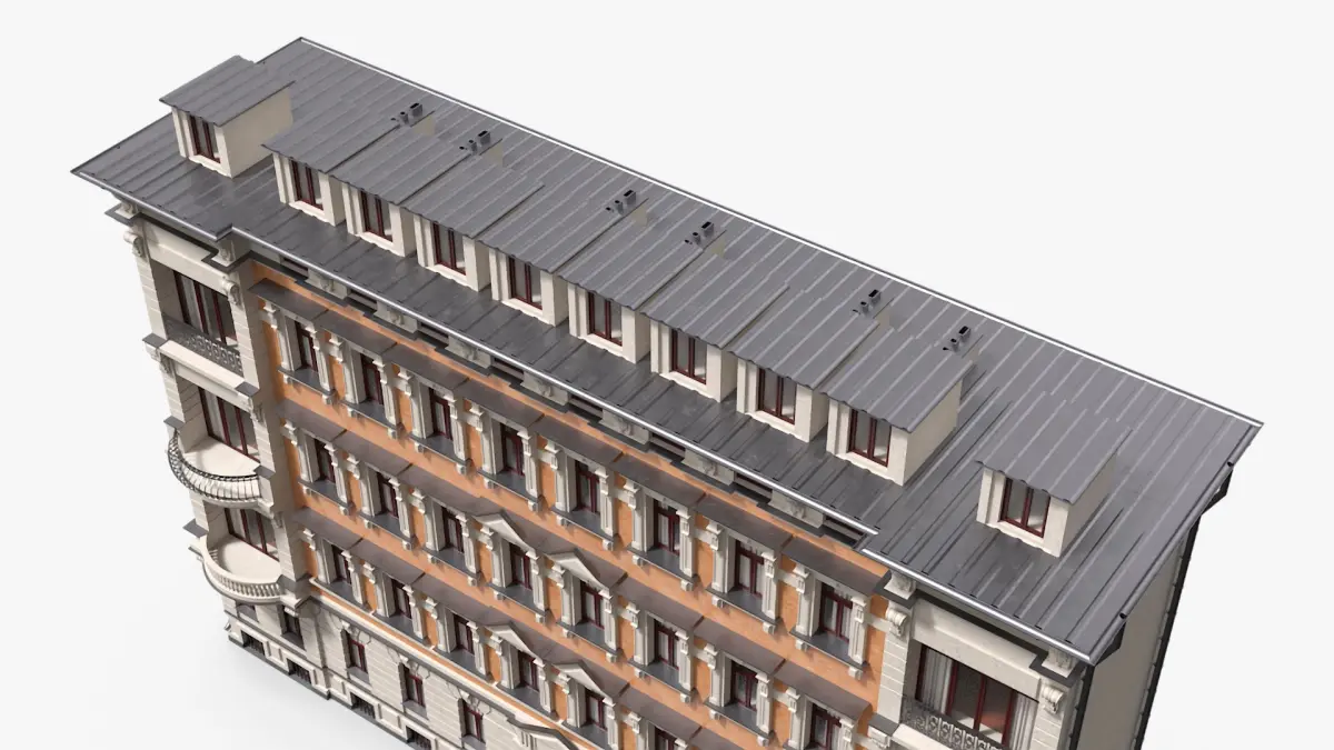 Historic European Apartment Building is a three-dimensional model of European style architecture specimen that is defined by its elegant style buildings from the 19th century, characterized by uniform facades, wrought-iron balconies, and mansard roofs.