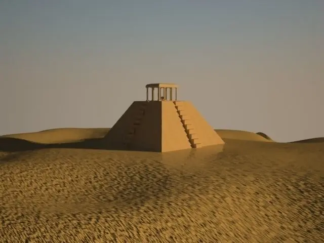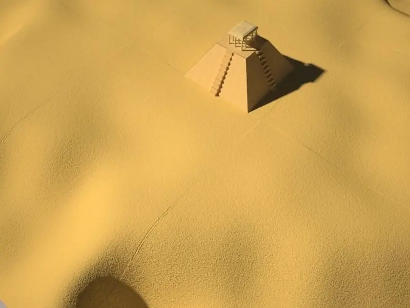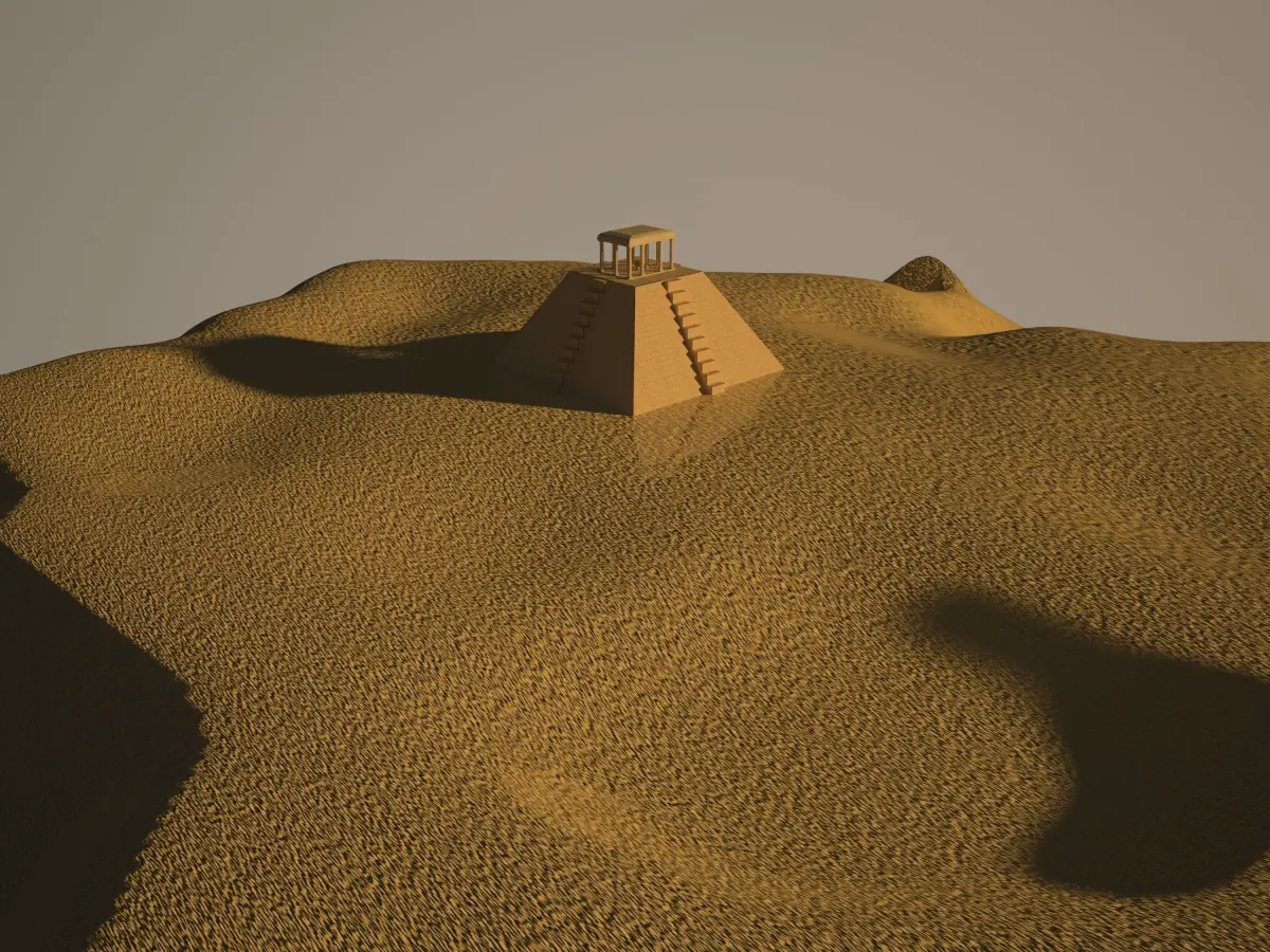 a Historic Pyramid shaped Temple in the desert with roman columns and a crystal wizard sphere, materialized with sun lighting and camera sittings, designed and 3D modeled by Architect Amr Almasri @ Calligraphy Art Applications