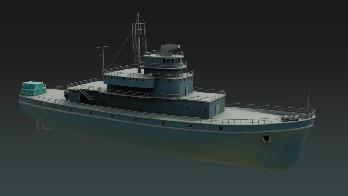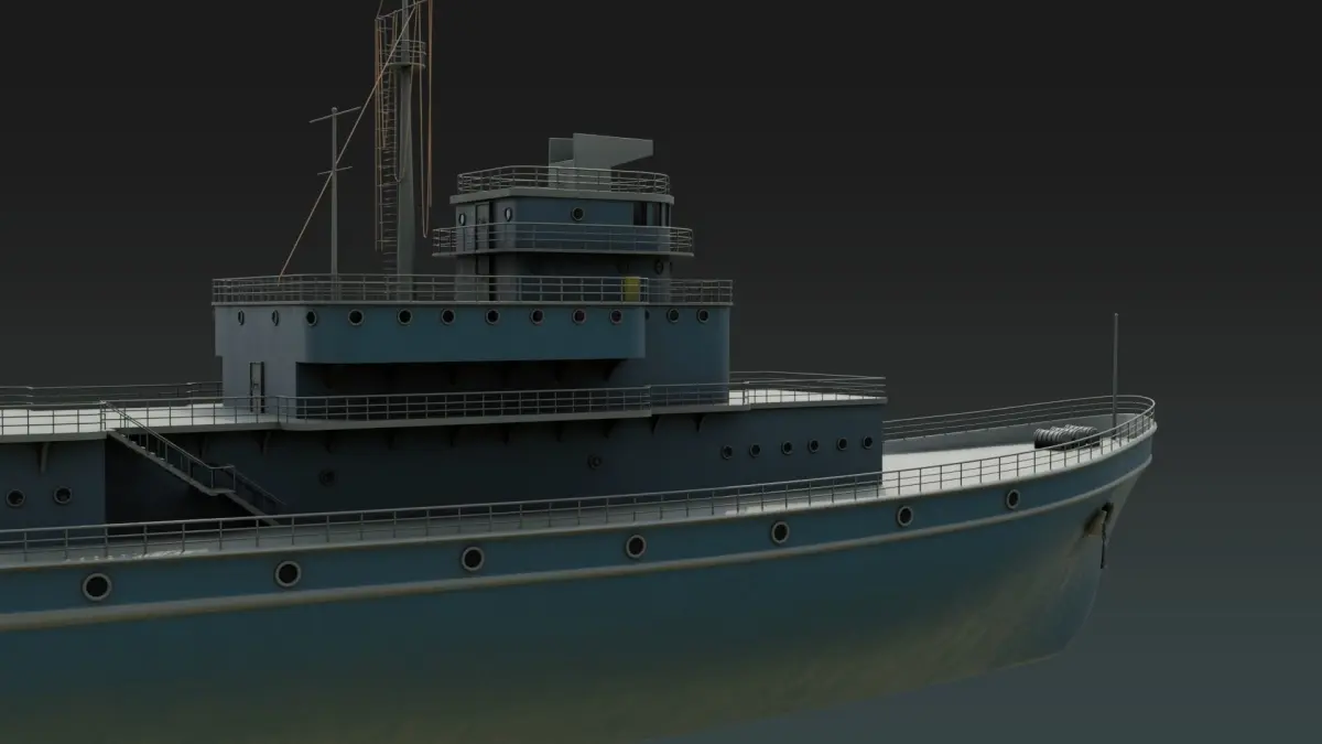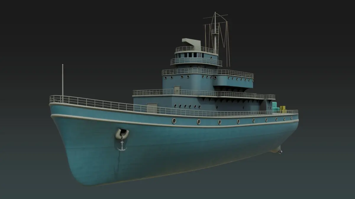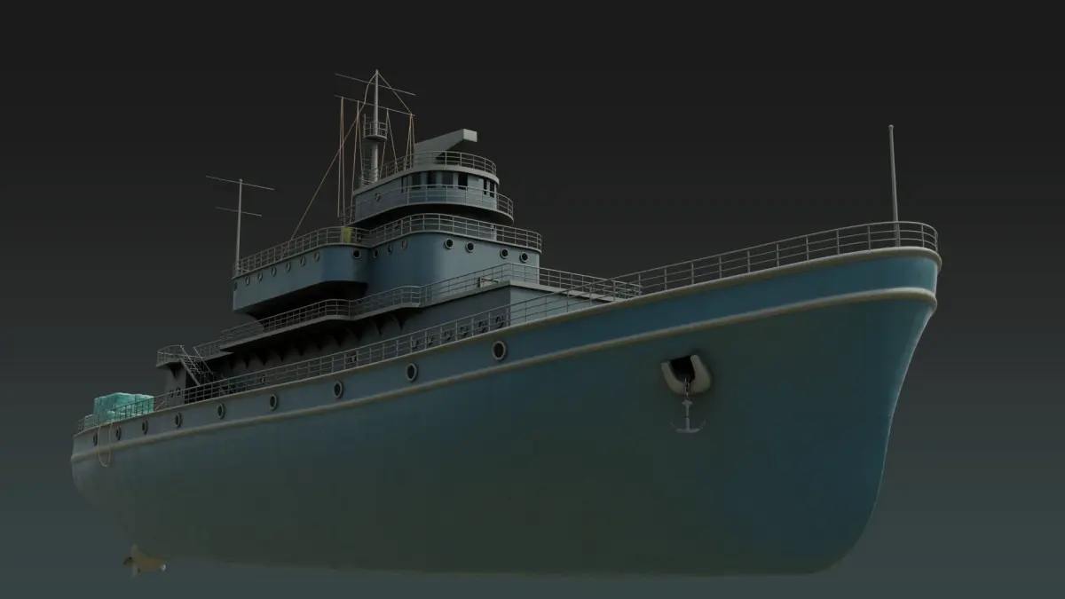 A replenishment ship from the historical timeline, characterized by its robust and sturdy construction, colored in a faded blue and olive green hue to blend in with the sea. The ship boasts a square-shaped structure with rusted metal accents, showcasing a weathered texture that tells tales of its voyages across the vast waters, serving as a crucial support vessel for naval operations.
