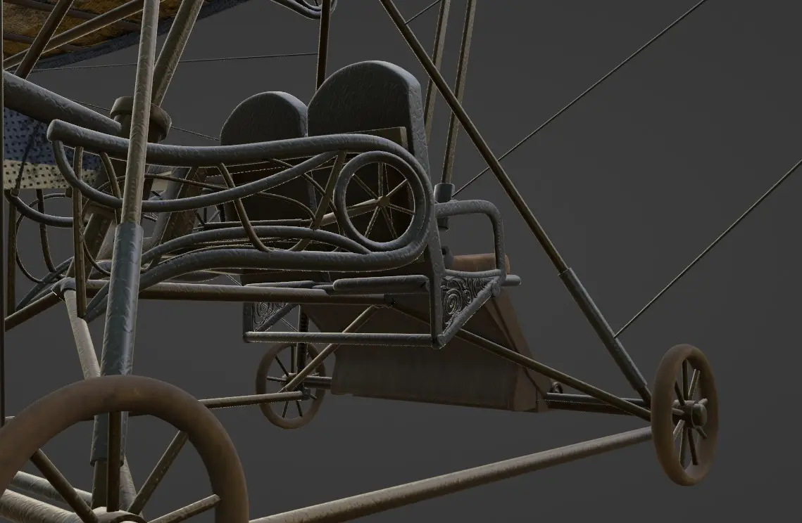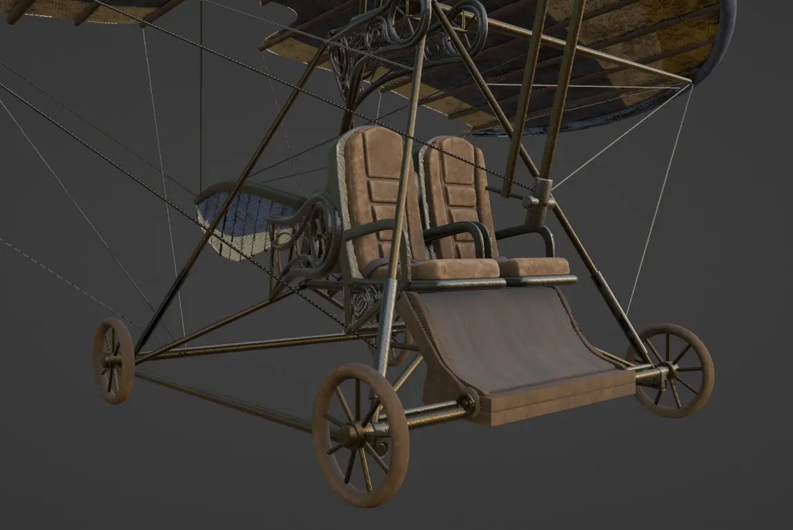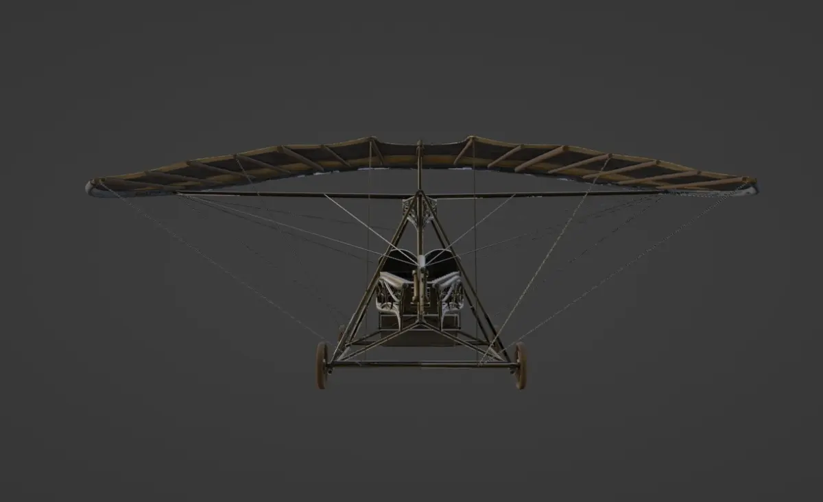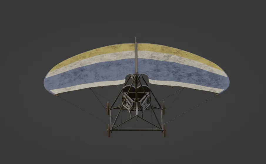 An antique hang glider from the historical civilian air timeline showcases a unique and captivating design. Its curved wing shape, adorned with a faded blue and yellow color scheme, reflects the artistry of early aviation. The canvas wings, bearing signs of wear and tear, exude a nostalgic charm that tells tales of countless flights. The metal frame, intricately detailed with ornate engravings, highlights the impeccable craftsmanship of a bygone era. Completing the piece, the pilot's harness is made of weathered leather, embodying the adventurous spirit of aviation pioneers. This timeless relic is a testament to human ingenuity and daring exploration.One of my favorite, btw, i have so much cool models, check it out!Best regards!