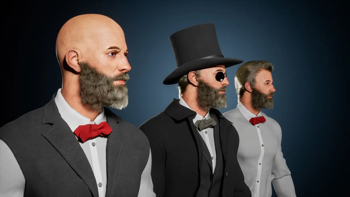 • Hair particle systems for Beard and Hair, plus an adjusted Hair system if the character wears a TopHat