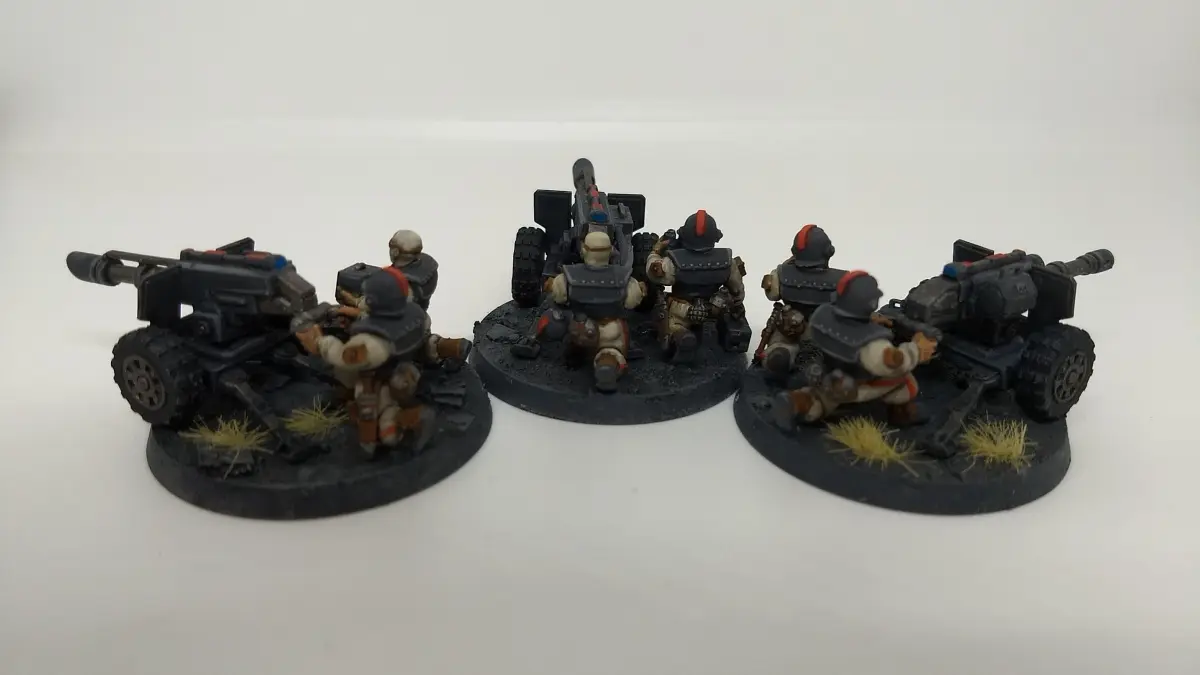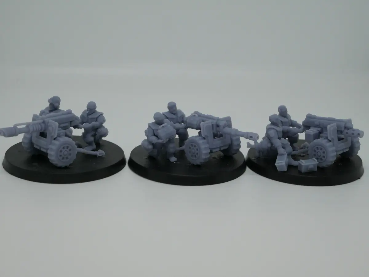 A multipart heavy weapons squad including torsos, arms, heads, heavy weapons and accessories for use in 28mm heroic scale sci-fi wargaming. Includes 2 variations of crouching torso, 8 heads, 5 different heavy weapons with wheeled trailers, accessories including ammunition, scabbards, grenades and arms for loaders and spotters.