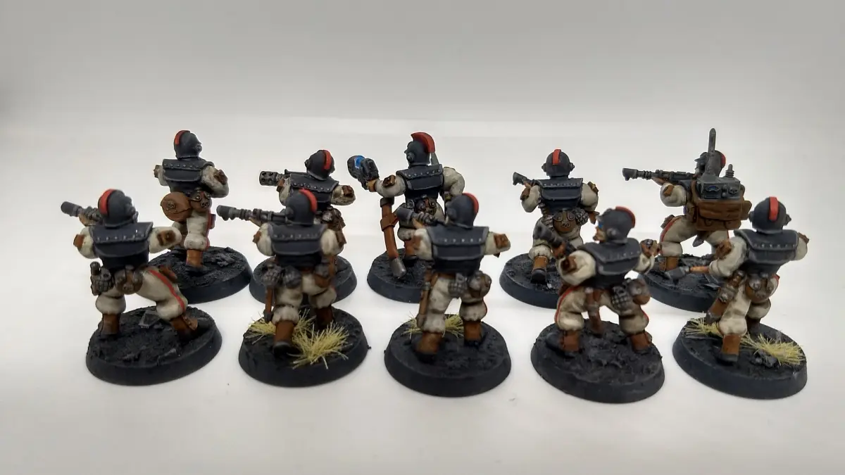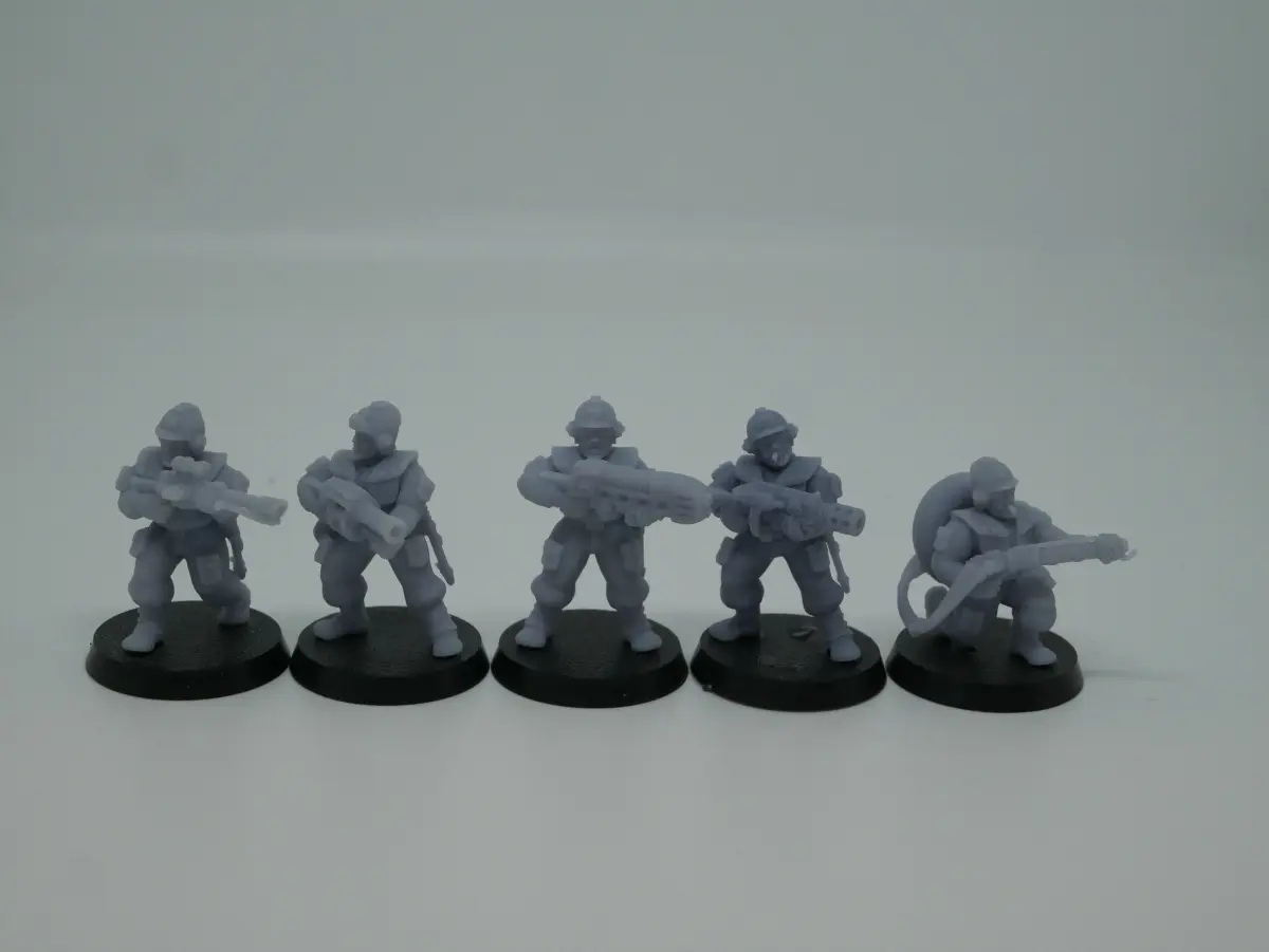 A multipart infantry squad including torsos, arms, heads and accessories for use in 28mm heroic scale sci-fi wargaming. Includes 6 variations of torso, 6 heads as well as several variations for sergeants, 5 lasguns, accessories including radio backpack, scabbards, holsters and grenades, multiple special weapons and close combat weapons.