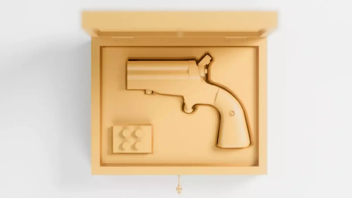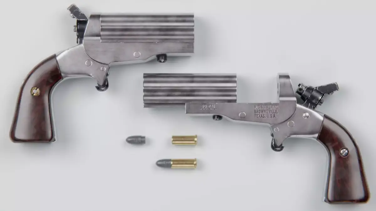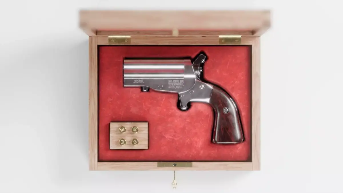 A lowpoly HJS Frontier Four .22 caliber derringer with a stainless steel frame and barrel and a Bakelite grip.This model also includes a handmade wooden box to keep the gun and four cartridges.Moving parts are split for animation purposes.